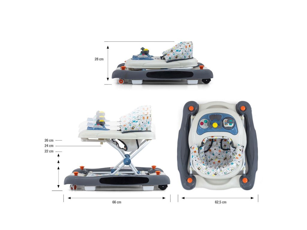 - Šírka vo verzii chodítka: 64 cm, vo verzii kolísky: 53 cm