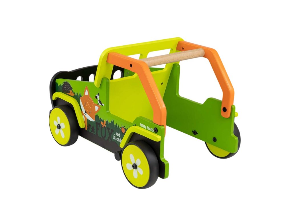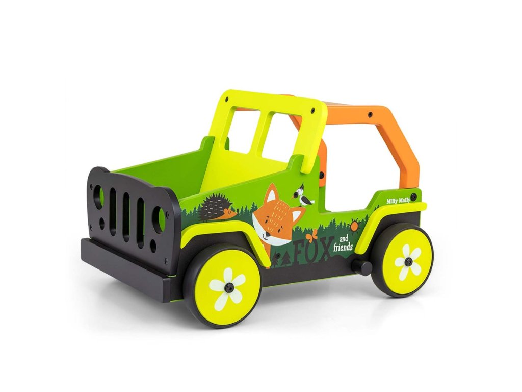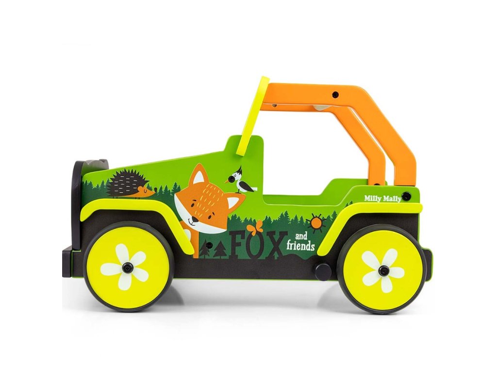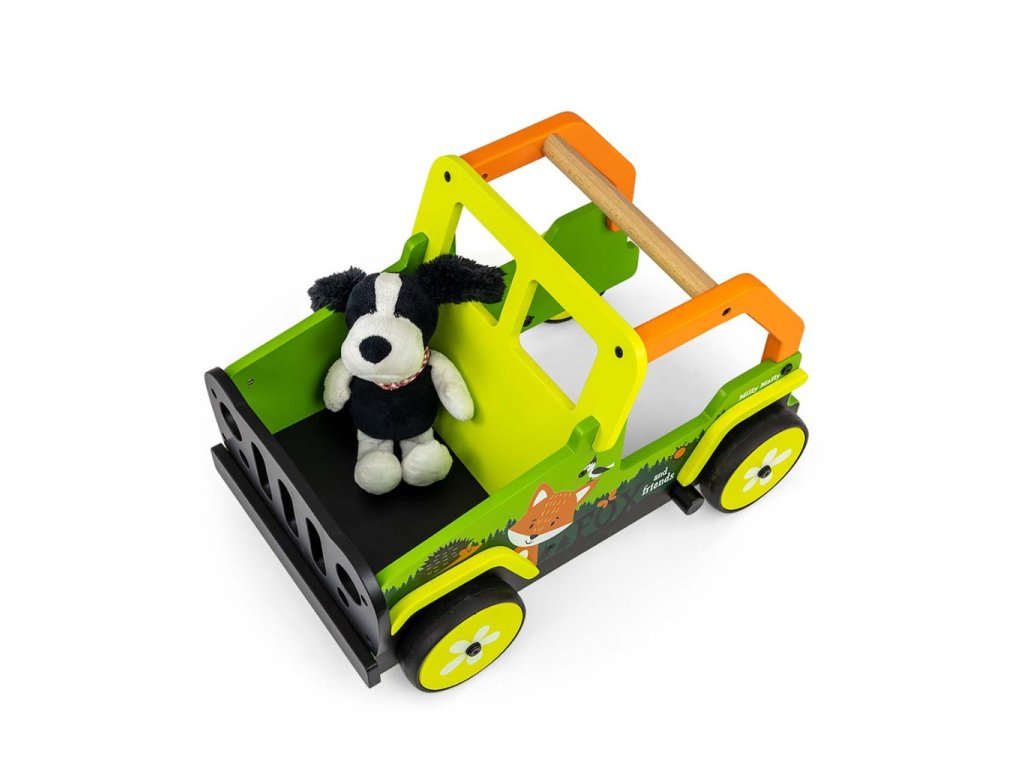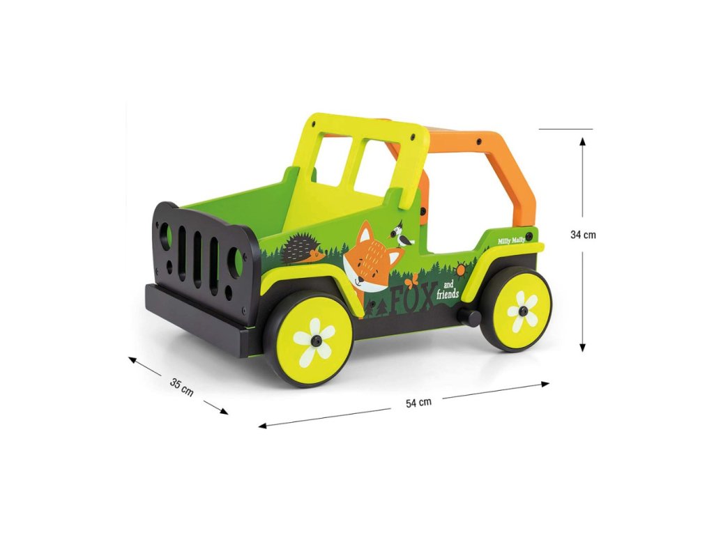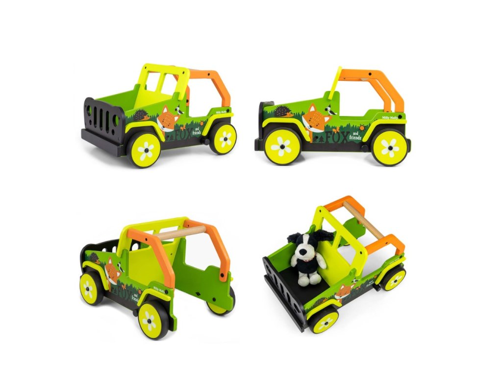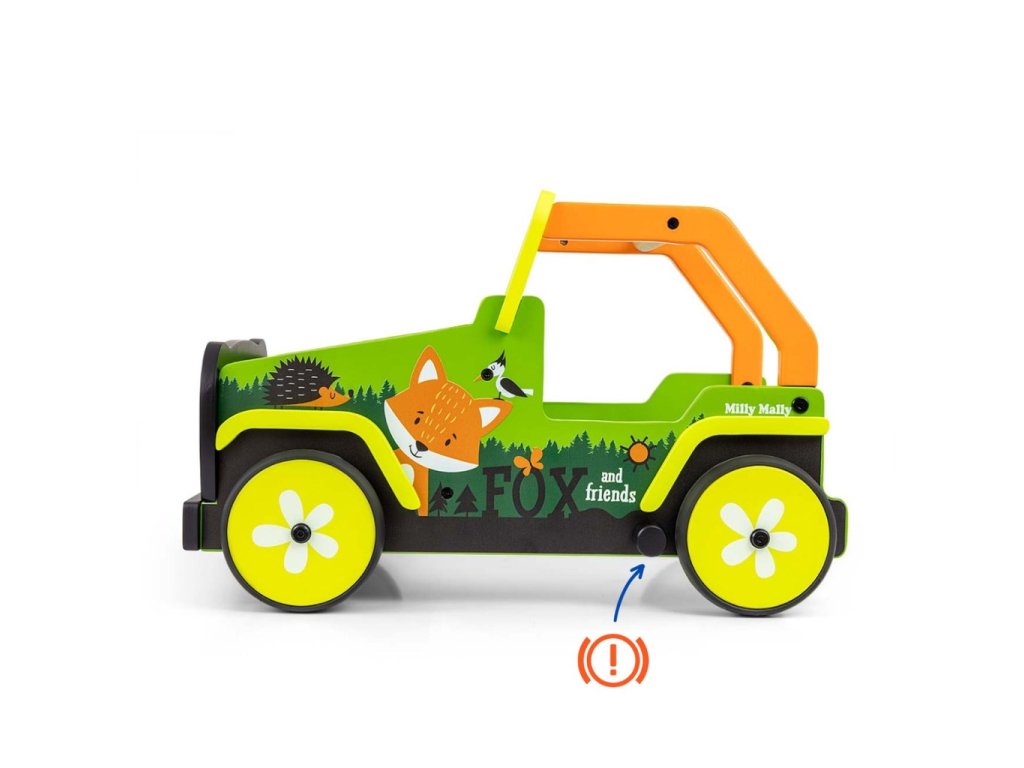 Toto detské chodítko, inšpirované legendárnymi terénnymi autami, je vyrobené z vysoko kvalitného dreva a ekologických materiálov. Kryty kolies sú vyrobené z mäkkého TPR plastu, ktorý je flexibilný a odolný a umožňuje použitie na všetkých povrchoch bez poškodenia alebo poškriabania. Neobsahujú zmäkčovadlá a sú šetrné k životnému prostrediu.