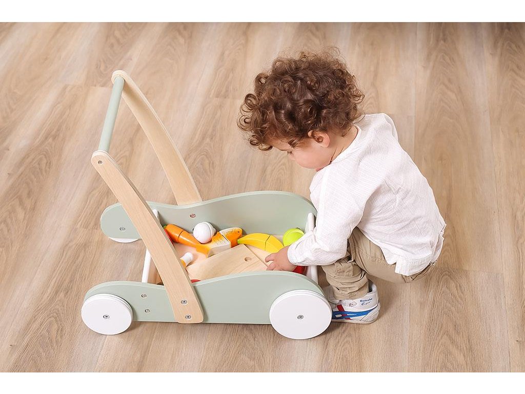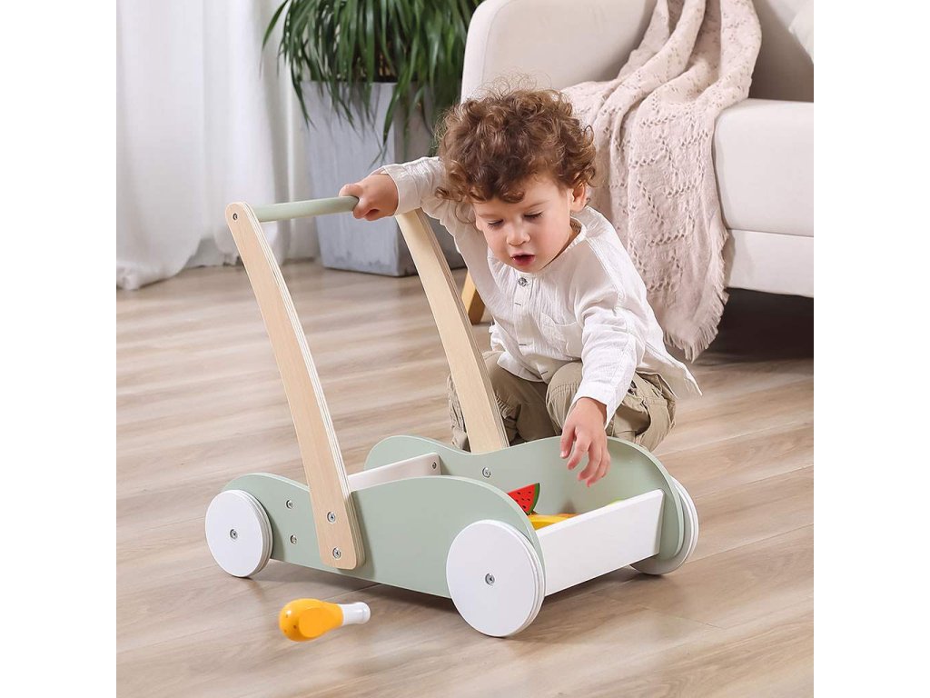 Hračka s jednoduchým dizajnom je tiež vybavená veľkými protišmykovými kolieskami a stabilnou, pevnou rukoväťou. Veľký úložný priestor umožňuje prepravu hračiek rôznych veľkostí a množstiev.