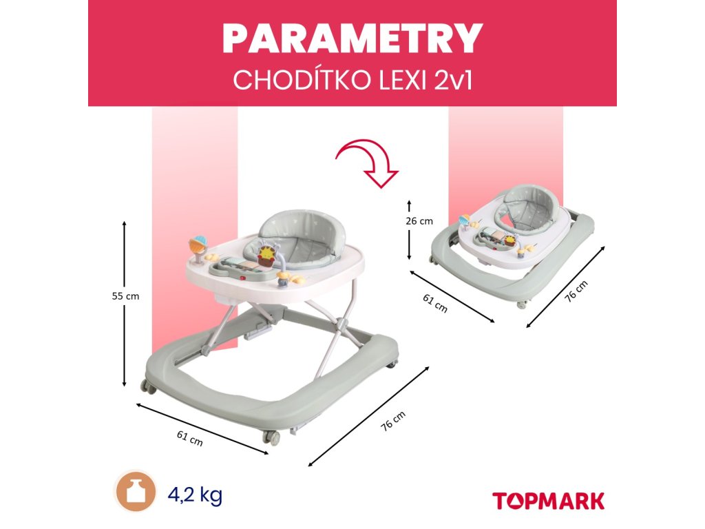- Chodítko možno po vybratí zadnej tyče premeniť v chodítko aktivity pre prvé krôčiky, chodítko je možné tlačiť.