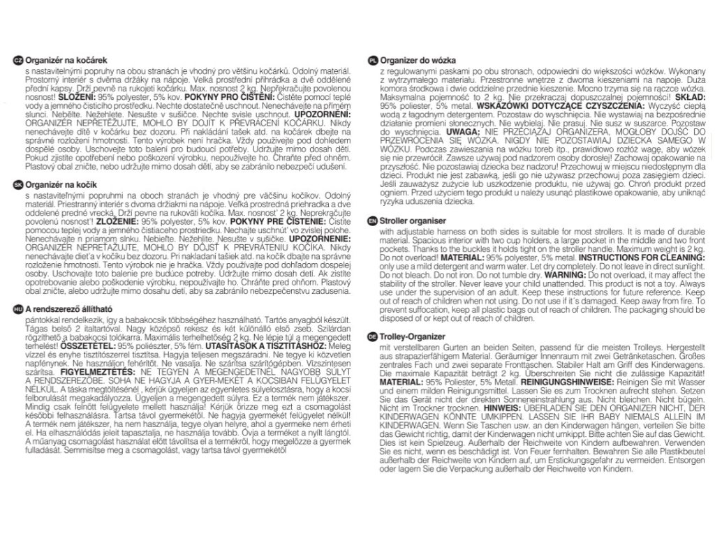 UPOZORNENIE! Tašku nepreťažujte, mohlo by dôjsť k prevráteniu kočíka! Nikdy nenechávajte dieťa v kočíku bez dozoru. Pri nakladaní tašiek na kočík dbajte na správne rozloženie hmotnosti. Tento výrobok nie je hračka. Vždy používajte pod dohľadom dospelej osoby. Uschovajte si toto balenie pre budúce potreby. Ak zistíte opotrebenie alebo poškodenie výrobku, nepoužívajte ho. Chráňte pred ohňom. Plastový obal zničte, alebo udržujte mimo dosahu detí, aby sa zabránilo nebezpečenstvu udusenia.