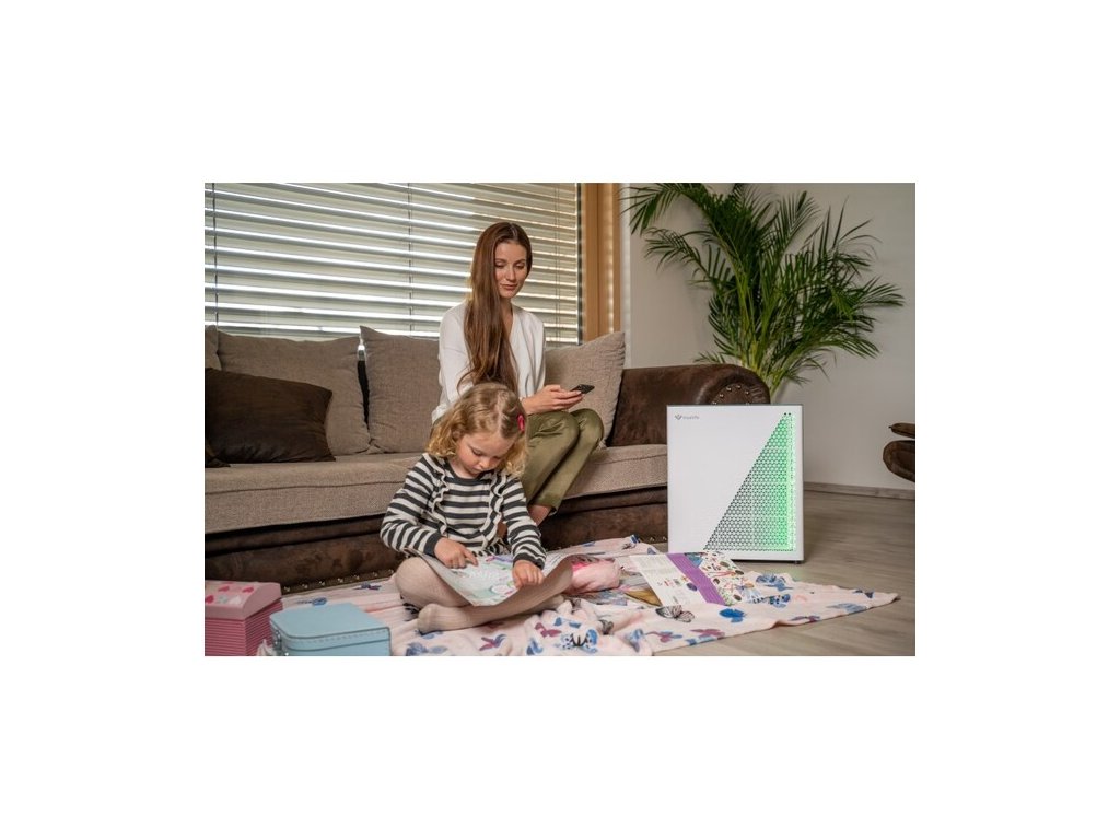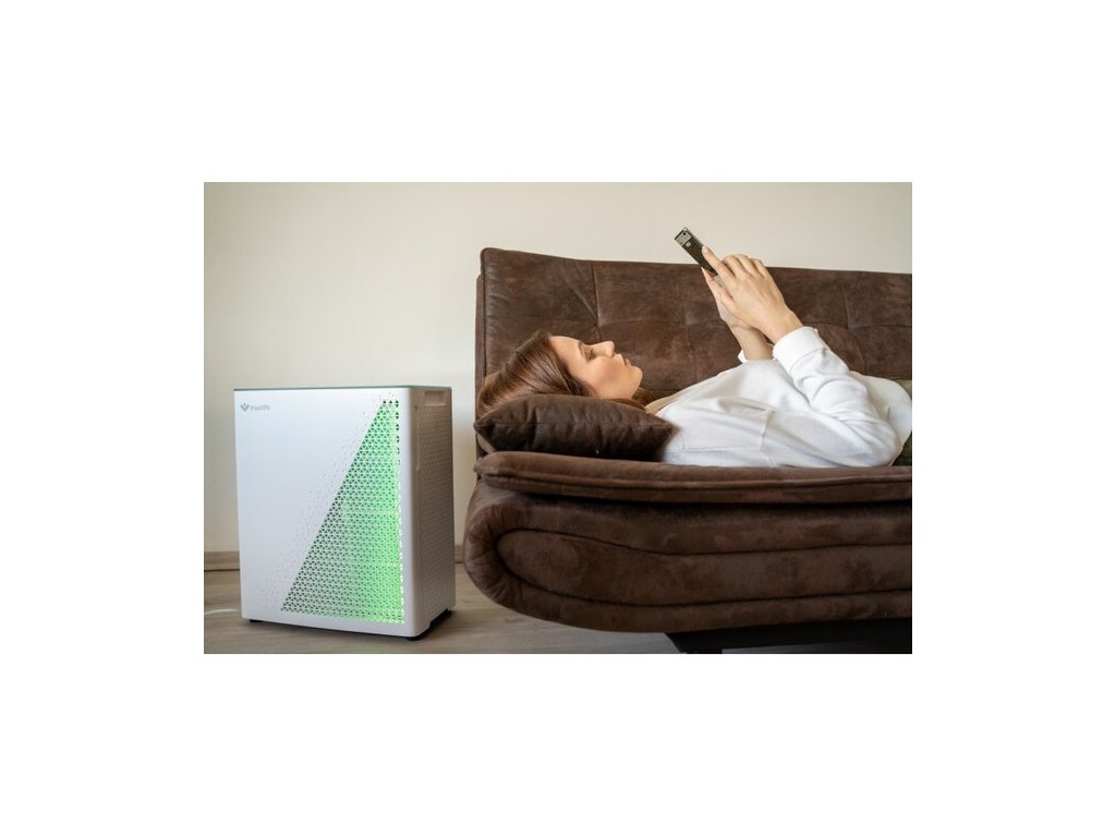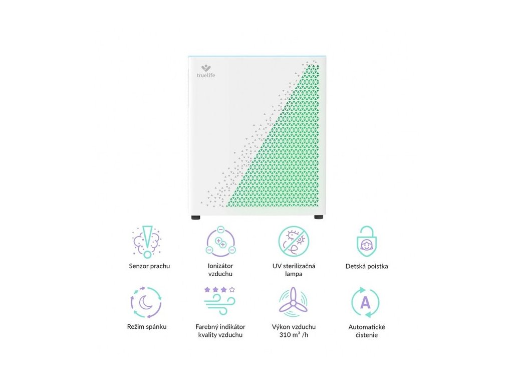 Čistička vzduchu TrueLife vyčistí až 310 m3 vzduchu za hodinu. Je vhodná do miestností o veľkosti 35-40 m2, môžete ju bez obáv prenášať. Čistička celkovo zlepšuje kvalitu vzduchu, ničí víry, baktérie a ďalšie nečistoty a môže tak významne pomôcť alergikom alebo astmatikom. Čistička je vybavená farebnými indikátormi kvality vzduchu, funkciou automatickej detekcie nečistôt a automatického čistenia. Ak bývate na mieste, kde sa často práši, poteší vás prítomnosť prachového senzoru. 7 násobná filtrácia v podobe pred filtra, antibakteriálneho filtra, HEPA filtra, uhlíkového filtra, katalytického filtra, UV svetla a ionizácie zachytí až 99.9% poletavého prachu a vyčistí 93.5% prchavých organických látok. Zároveň zachycuje aj víry a koronavíry.