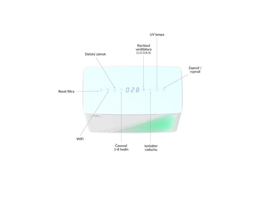 Ovládanie čističky vzduchu je veľmi jednoduché a intuitívne. Všetky funkcie možno nastaviť pomocou ikon na dotykovom displeji.