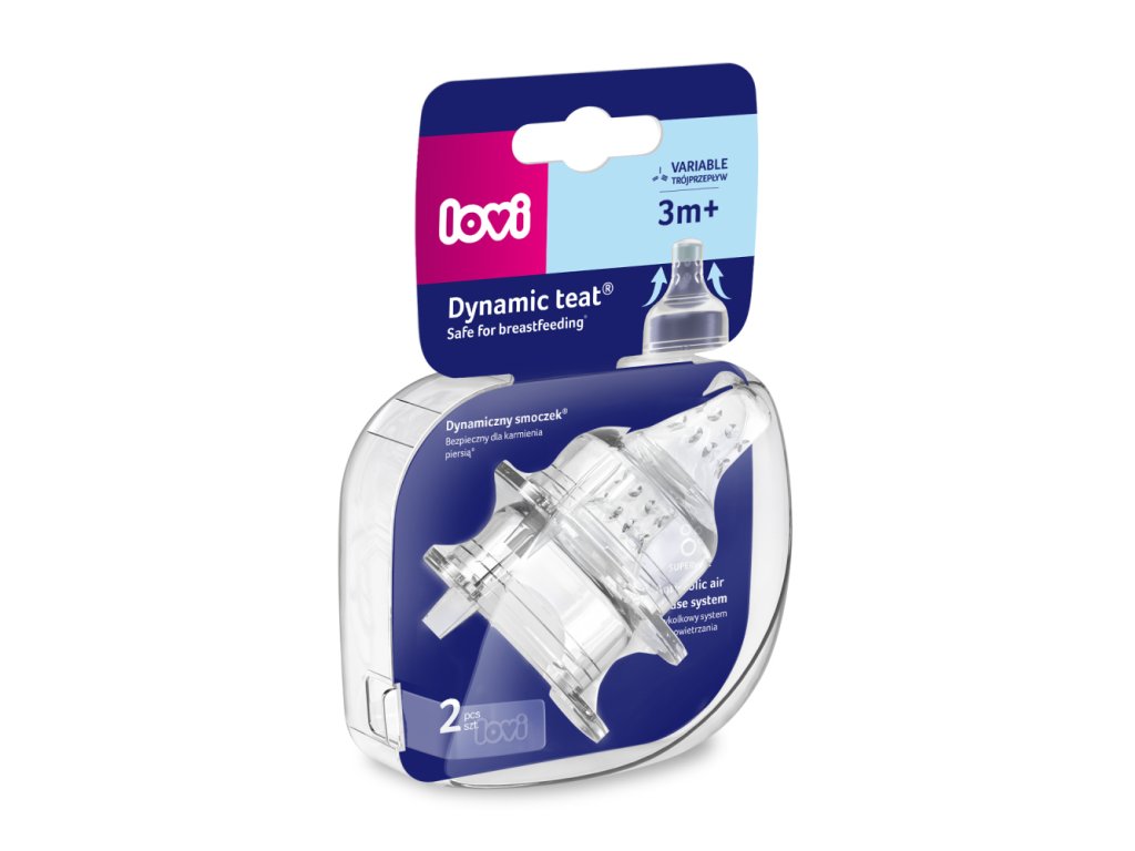 Dynamický cumlík® LOVI na podávanie odsatého materského mlieka je výsledkom práce klinických neurologopédov. Je vyrobený z heterogénnej vrstvy silikónu: má mäkký, tenký, naťahujúci sa koniec a širokú, hrubú a tvrdú profilovanú základňu. Vďaka tomu nenarušuje sací reflex dieťaťa a tým chráni dojčenie. UPOZORNENIE: Značka LOVI odporúča dojčenie ako najzdravší spôsob kŕmenia. Ak dojčenie nie je možné, alebo je nedostatočné, začatie podávania pokrmu v alternatívnej podobe sa odporúča výlučne po konzultácií s lekárom, pôrodnou asistentkou, alebo lekárnikom.