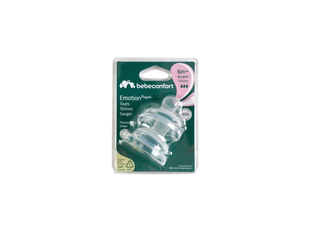 Silikónový cumlík fyziologického tvaru Bebeconfort Emotion Physio je zárukou, že dieťa takmer nepociťuje rozdiel medzi dojčením a kŕmením z fľaštičky. Dvojitý ventilačný systém na okraji cumlíka citlivo zabezpečí únik vzduchu z fľaše, tým umožní plynulé sanie tekutiny a zároveň znižuje riziko brušnej koliky.
