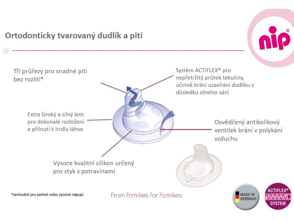 Či už ide o cumlík guľatý, anatomický alebo o náustok: nip® má pre každú fľašu, každý vek a každú potrebu ten správny cumlík. Pri pití sa dokonale tvarujú podľa poschodia vášho dieťaťa a vytvárajú prirodzený pocit pitie.