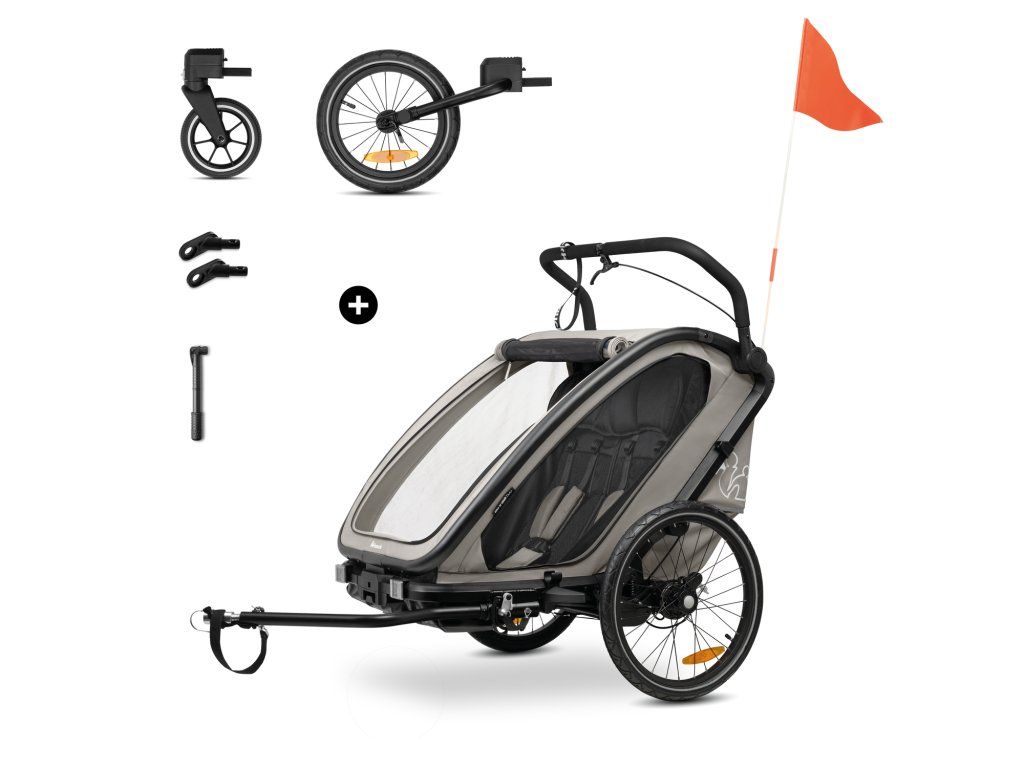 Prispôsobte cyklovozík svojmu štýlu - Na prechádzky, jazdu na bicykli alebo na šport - multifunkčný cyklovozík BIKE N WALK DUO je pripravený na akýkoľvek spôsob jazdy. Súčasťou balenia je ťažná tyč, ochrana kolies, vlajka, koles na prechádzky aj športové koleso a pumpička - všetko v jednej krabici k dispozícii pre váš aktívny životný štýl. Cyklovozík ľahko prestavíte v niekoľkých krokoch a rovnako ľahko ho zložíte na uskladnenie.