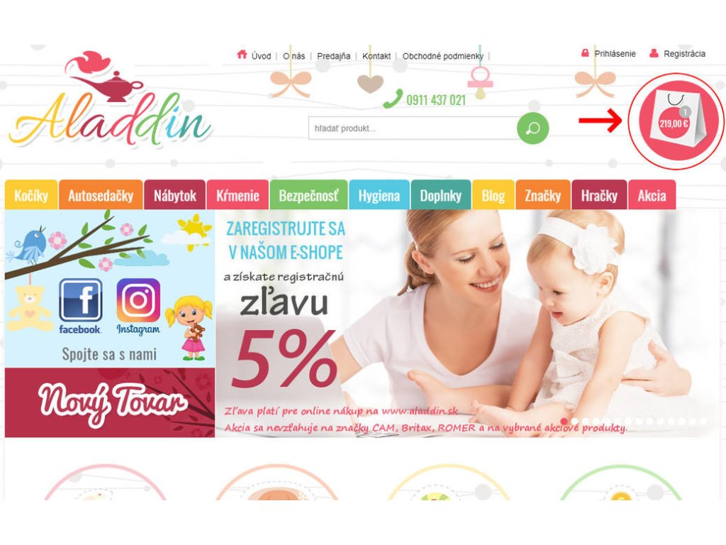 Po vložení tovaru do nákupného košíka prejdite do nákupného košíka - kliknutím na ikonu nákupného košíka (označené šipkou na obrázku):