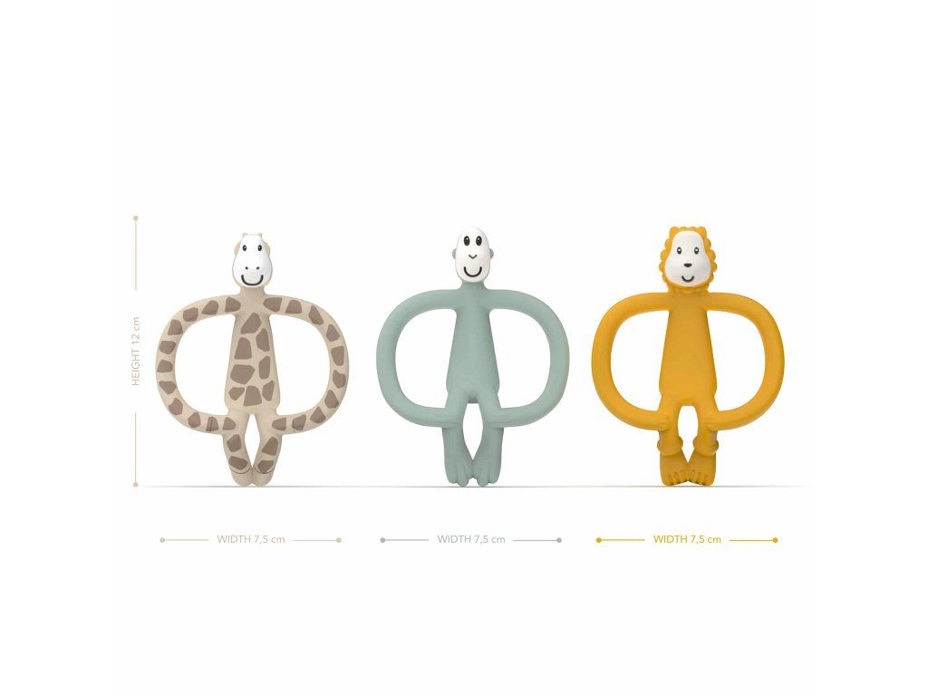 Perfektný darček pre čerstvých rodičov, ktorý má krásny dizajn a je obľúbený medzi detičkami! Získajte hneď 3 ocenené hryzadlá Matchstick Monkey - žirafu Gigi, leva Luda a opičku vo farbe Mint Green ako set 3 v 1! Hryzadlá Matchstick Monkey sú ideálne pre malé ručičky a poskytujú upokojujúcu úľavu boľavým ďasnám. Vďaka šikovným hrbolčekom na zadnej strane hlavy opice je pre rodičov ľahké nanášanie prípravkov na prerezávanie zúbkov a masírovanie ťažko dostupných stoličiek. Ľahko uchopiteľné rukoväte pomáhajú rozvíjať jemnú motoriku a umožňujú bábätkám upokojiť sa. Pridaná antimikrobiálna ochrana BioCote® pomáha chrániť hryzadlo pred širokým spektrom mikróbov, pričom bráni baktériám. Hryzadlá zostanú dlhšie svieže a čistejšie. Ľahko sa čistia v umývačke riadu alebo sterilizátore, pre úľavu od bolesti ich možno umiestniť do chladničky. Vlastnosti: • S mäkkými a jemnými hrbolčekmi zubnej kefky na masáž ďasien • Perfektné na aplikáciu prípravkov na prerezávanie zubov na ťažko dostupné stoličky • Nízka hmotnosť uľahčuje držanie od útleho veku • Obsahuje BioCote ® Antimikrobiálnu ochranu, ktorá udrží hryzadlo dlhšie svieže a čistejšie • Ergonomicky navrhnuté rukovúze pomáhajú rozvíjať jemné motorické zručnosti • Možno použiť ako prvú tréningovú zubnú kefku • Vhodné do umývačky riadu a chladničky • Vhodné pre sterilizáciu studenou vodou a parou • Balené v prenosnej krabičke na opakované použitie • Bez BPA a schválené FDA • Výška: 10,5cm • Vhodné od 3 mesiacov veku dieťaťaDodatočné parametre