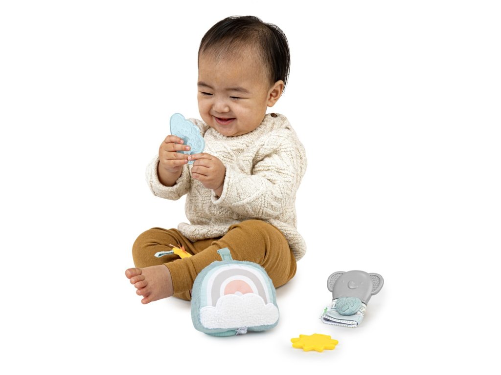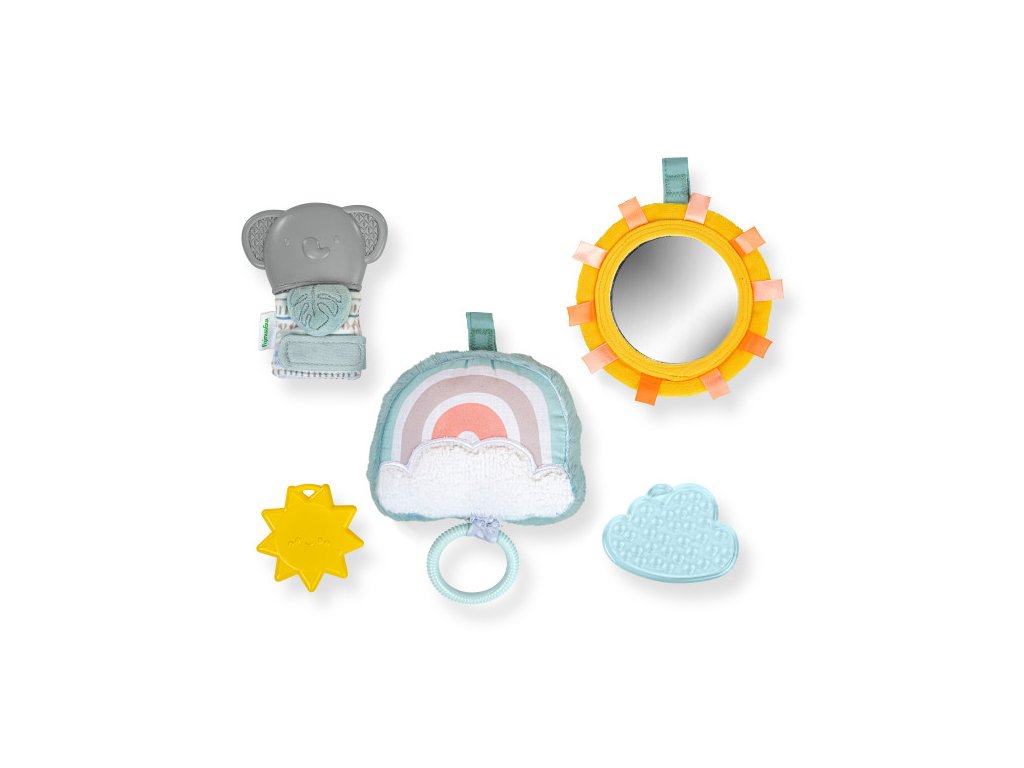 Prežívať prvý rok bábätka je obohacujúce, ale zároveň náročné - a darčeková súprava Ingenuity Calm Springs Soothing Essentials obsahuje všetko, čo vám túto cestu spríjemní. Tento balíček, ktorý musí mať novorodenec, upokojuje bábätko doma alebo na cestách.Súprava obsahuje hudobnú plyšovú hračku, hryzačku Van the elephant, slnečné zrkadlo s visačkami a 2 hryzačky bez obsahu BPA. Päťdielna súprava zapája zmysly dieťaťa tromi spôsobmi: hudobná plyšová hračka upokojuje jemnými zvukmi, rukavička na hryzenie a hryzačky prinášajú úľavu boľavým ďasnám a slnečné zrkadlo s visačkami ponúka upokojujúce skúmanie. Súprava podporuje hmatové zručnosti dieťatka vďaka tomu, že obsahuje základné pomôcky v rôznych textúrach a materiáloch.