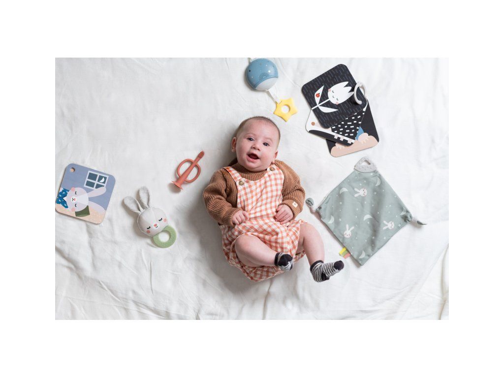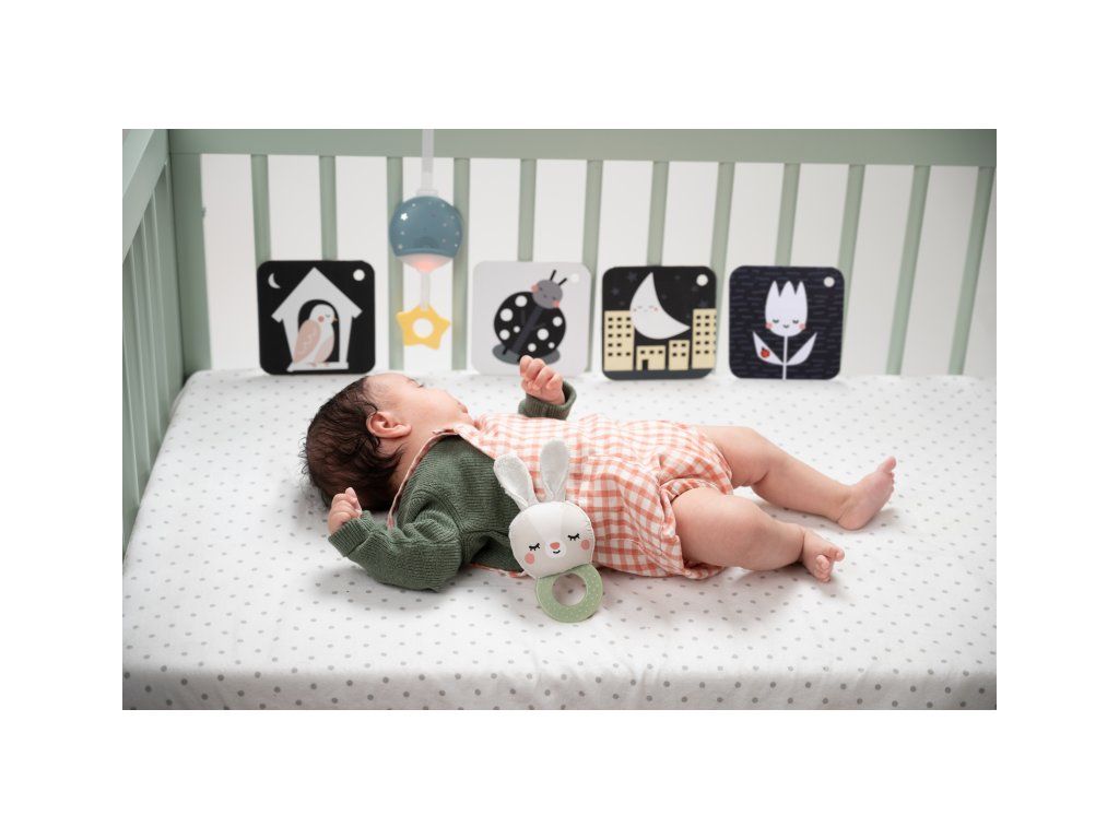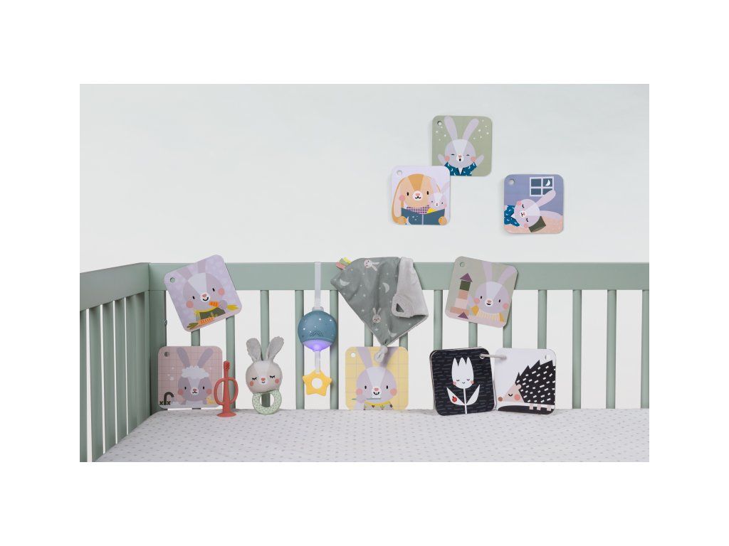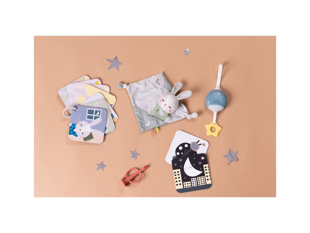 Sada obsahuje jemné nočné svetielko hudbou, mäkkú silikónovú kefku na zúbky, maznáčika s hryzátkom, hryzátko zajačika a 7 obojstranných ilustrovaných kariet s krúžkom na spájanie.