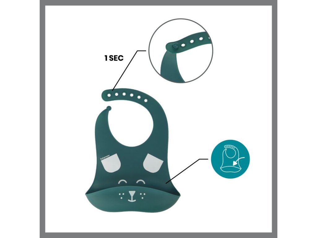 - podbradník má priestranné vrecko na popadané jedlo a nastaviteľné zapínanie