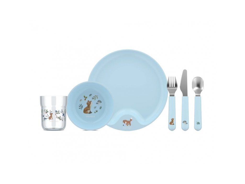 6-dielna jedálenská súprava v krásnom dizajne s jemnou potlačou obsahuje detský tanier, misku, téglik, lyžicu, vidličku a nôž.