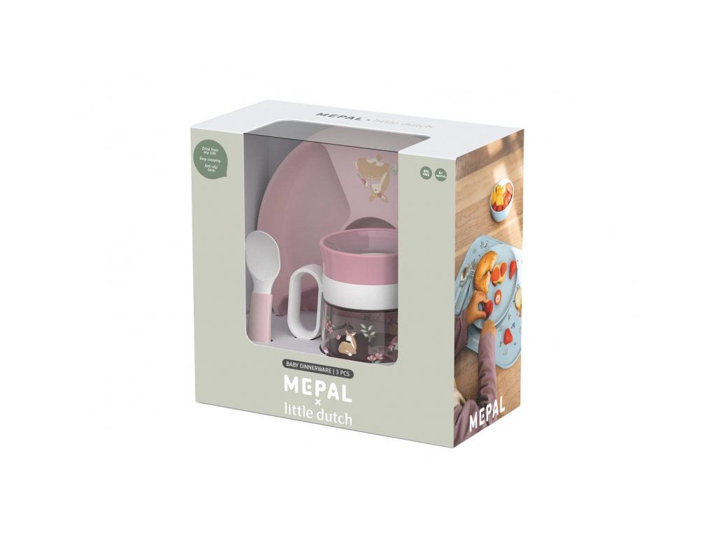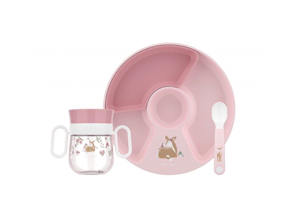 3-dielna jedálenská sada v krásnom dizajne s jemnou potlačou obsahuje detský delený tanier, trénovací hrnček so systémom 360 ° a lyžičku.