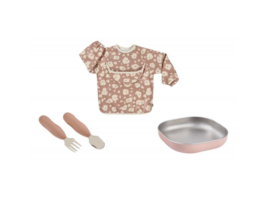 Jedálenskú sadu pre najmenších tvorí nerezový tanier so silikónovou povrchovou vrstvou, ergonomická tréningová lyžička a vidlička a podbradník s odopínacími rukávmi a vreckom na omrvinky. Krásnu krabičku, v ktorej je sada zabalená môžete používať aj ako krabičku na drobnosti.
