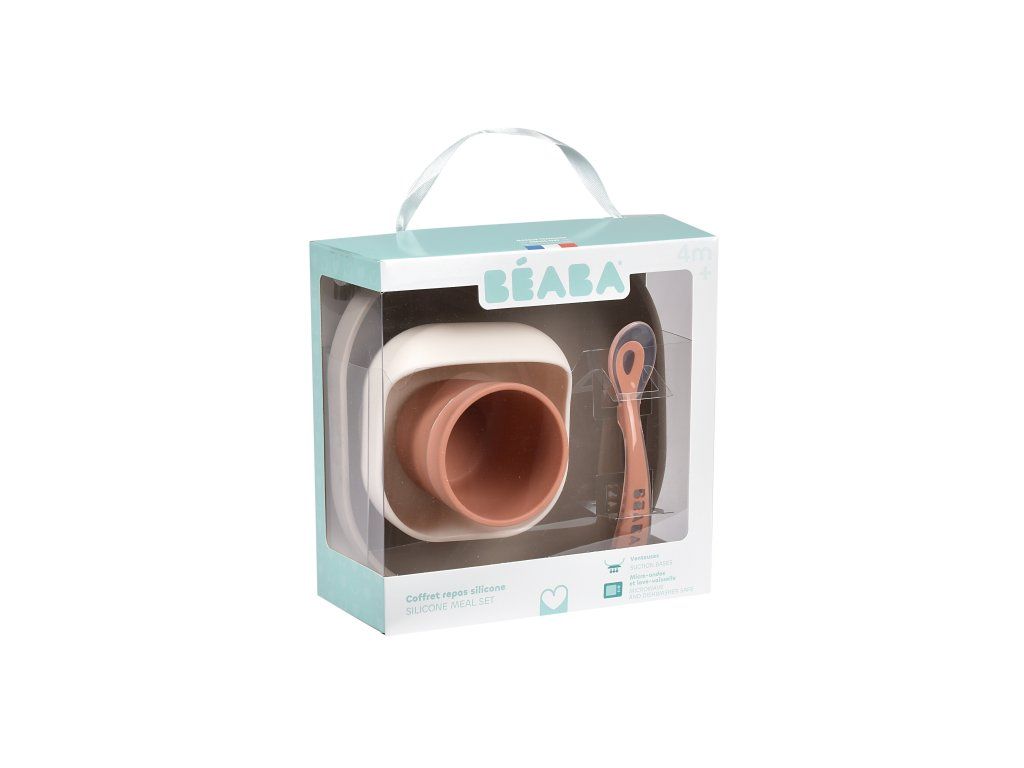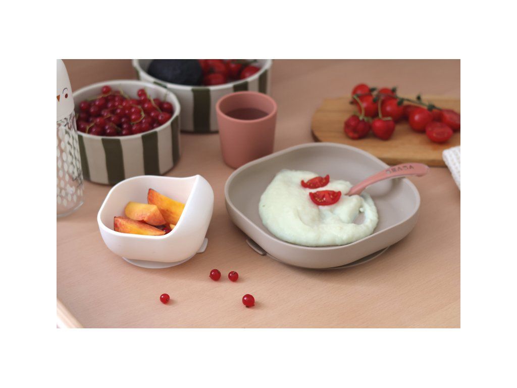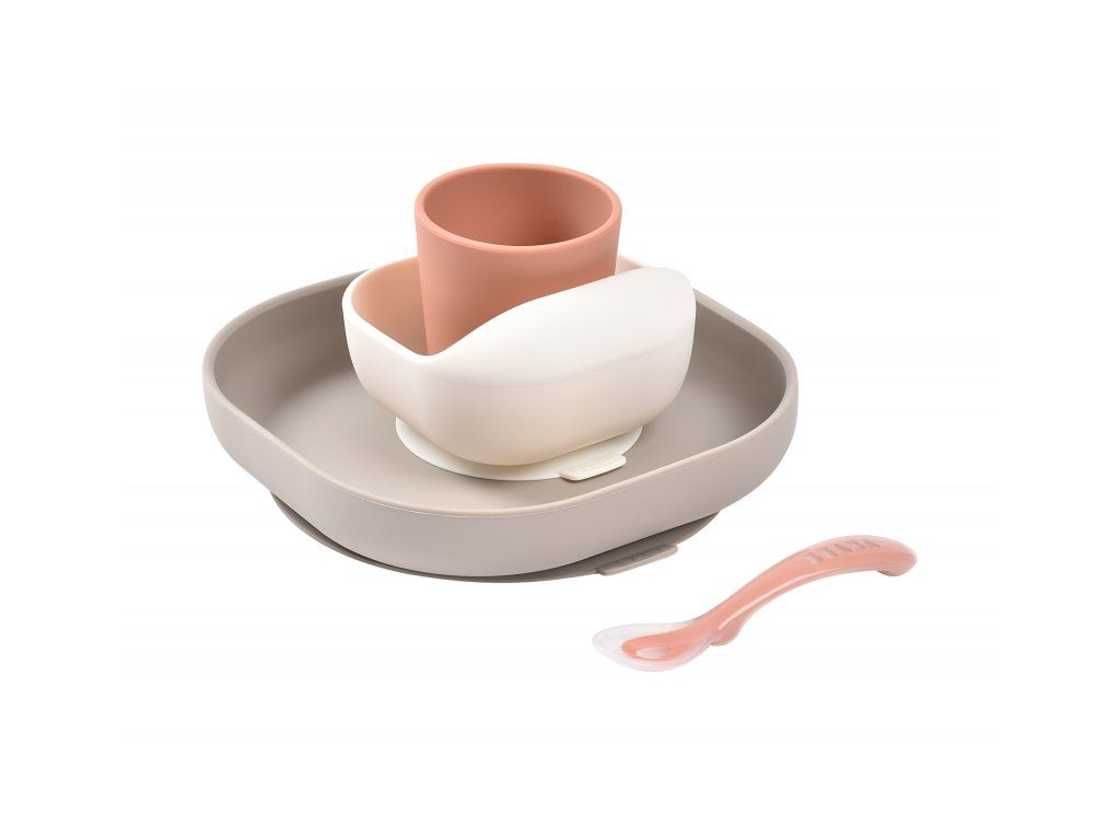 Sada taniera, misky, téglika na pitie a lyžičky z vysoko kvalitného silikónu je ideálna pre prvé samostatné kŕmenie. Prísavka pri miske a tanieri umožňuje uchytenie k stolu alebo pultu jedálenskej stoličky. Ergonomický tvar uľahčuje naberanie príkrmu.