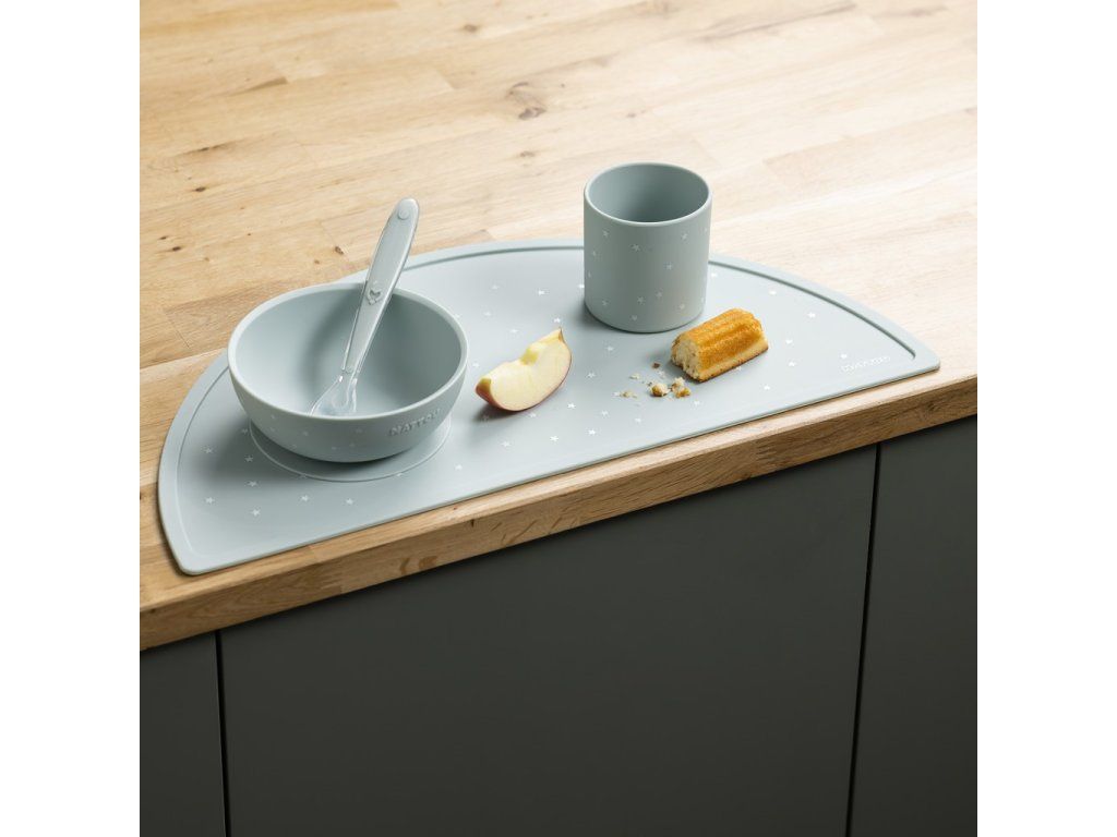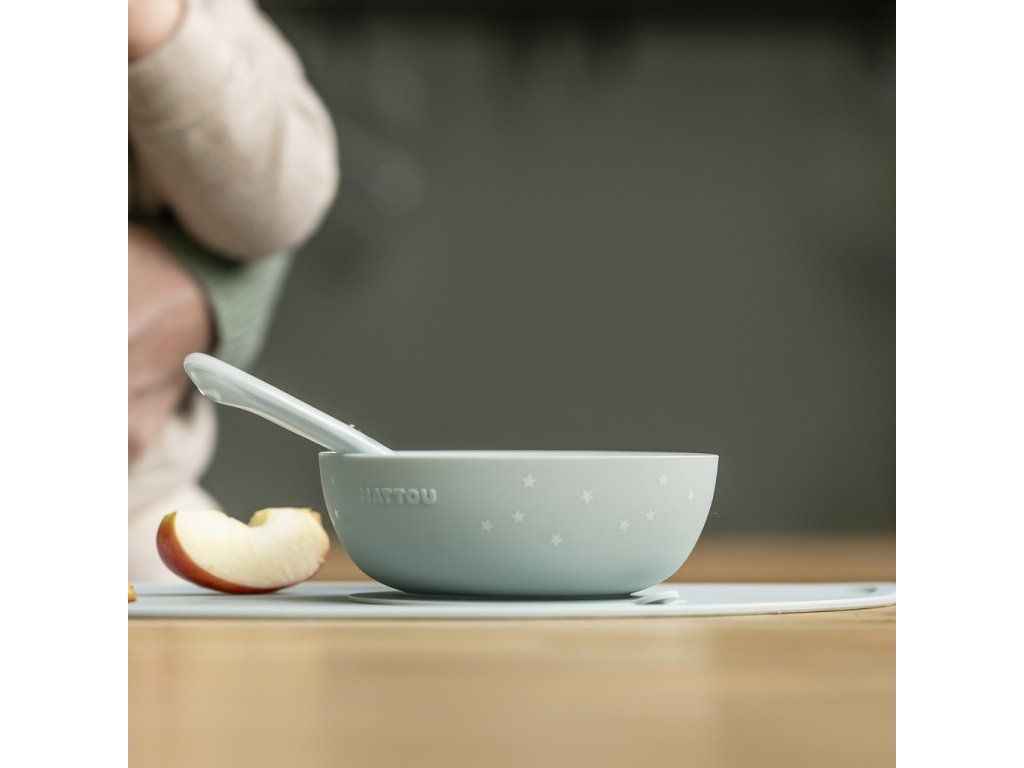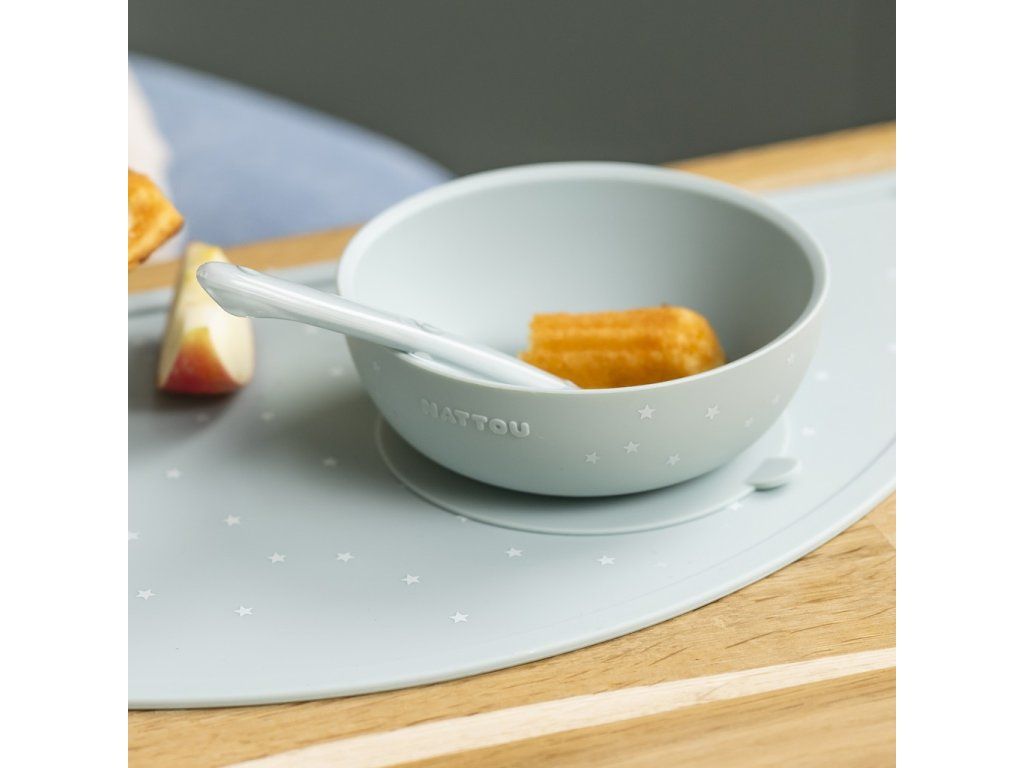 S touto elegantnou silikónovou jedálenskou súpravou môže vaše dieťatko jesť bez obáv. Zvýšený okraj taniera a prísavná podstava zabraňujú vylievaniu jedla na zem. Lyžička je dokonale prispôsobená malým rúčkam a ústam bábätiek a malých detí, takže sa stáva ideálnym pomocníkom pri kŕmení a učení sa samostatnosti.Vlastnosti: