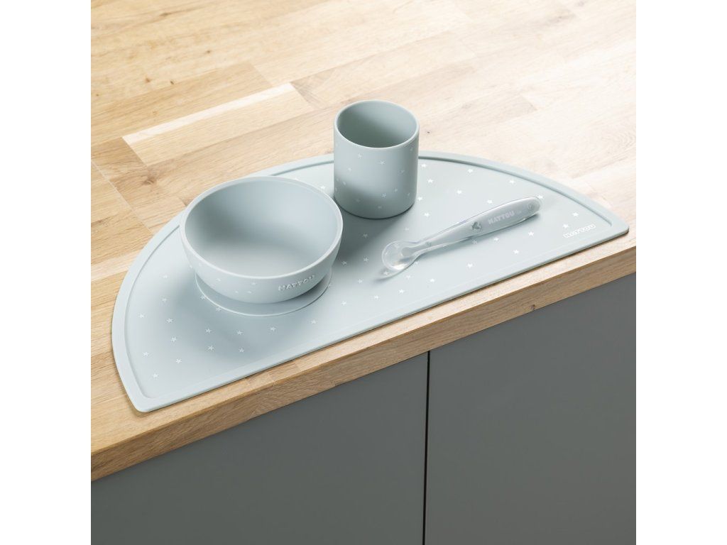 - Jedálenská súprava pre bábätká a malé deti: tanier, miska, pohár a lyžička z mäkkého silikónu.