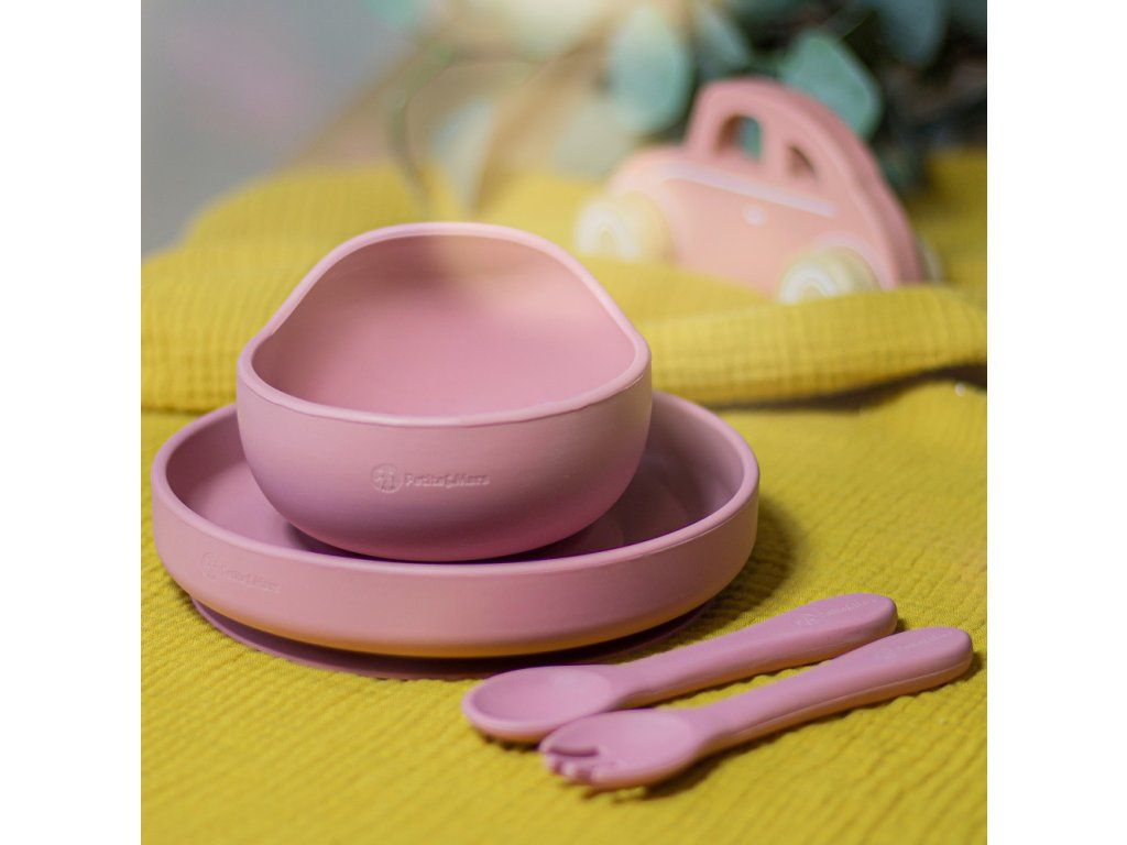 PETITE&MARS Set jedálenský silikónový TAKE&MATCH 3 ks Dusty Rose 6m+