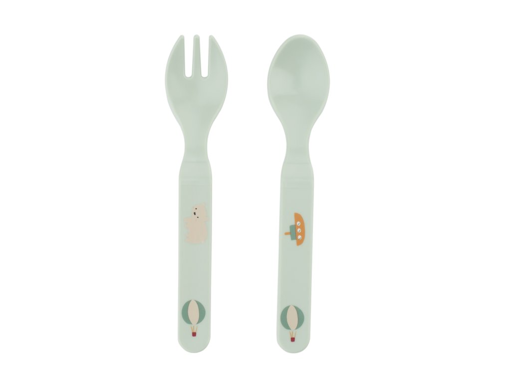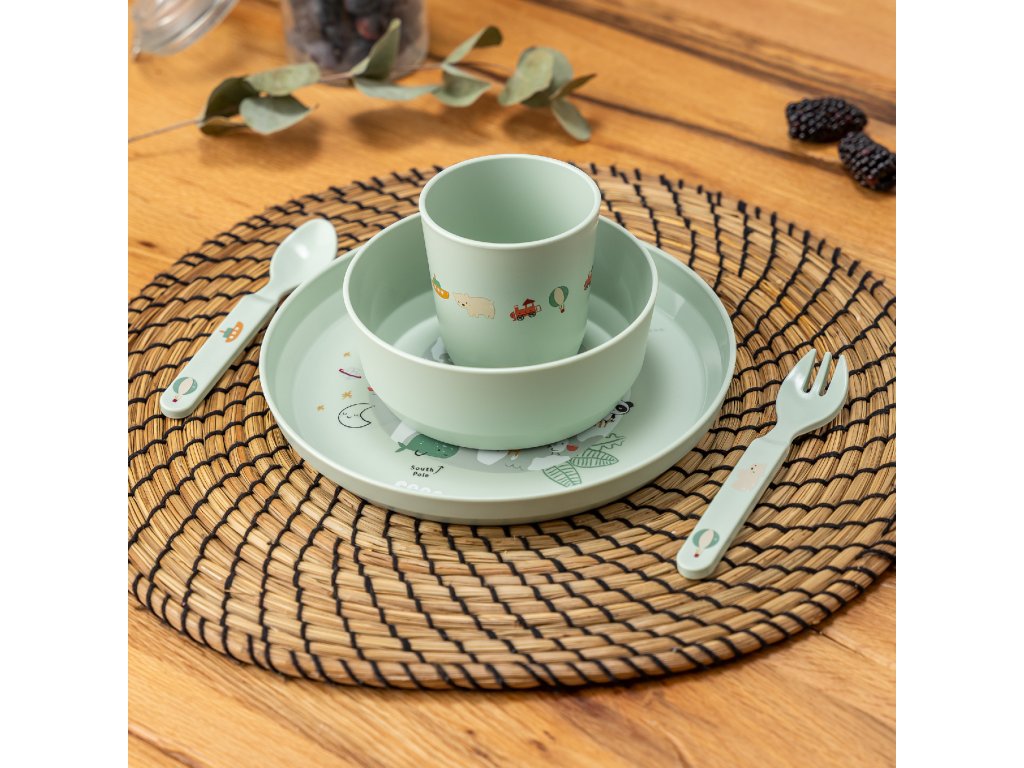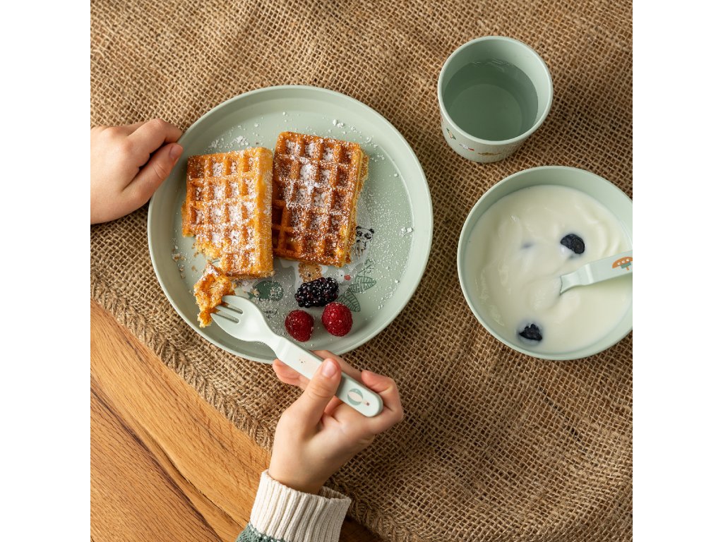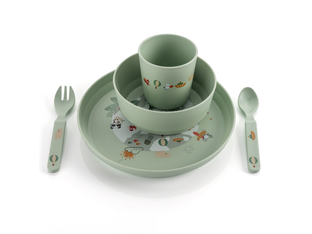 Zvláštny dôraz bol kladený na bezpečnosť. Všetky časti majú oblé hrany, mäkké hroty vidličky a plochú lyžičku, ktorá je ideálna pre prvé krôčiky bez rizika poranenia. Súprava je odolná voči rozbitiu a neobsahuje BPA ani ftaláty. Výrobok je zhotovený zo 100 % prírodného bio-cirkulárneho polypropylénu certifikovaného podľa ISCC PLUS (metóda hmotnostnej bilancie), ktorý pochádza z obnoviteľných surovín. Je to vedomý krok k ochrane životného prostredia a lepšej budúcnosti našich detí. Je možné ju umývať v umývačke aj používať v mikrovlnnej rúre (max. 600 W). Little Explorer (zelená) a Little Farm (béžová) premení každé jedlo na malé dobrodružstvo.