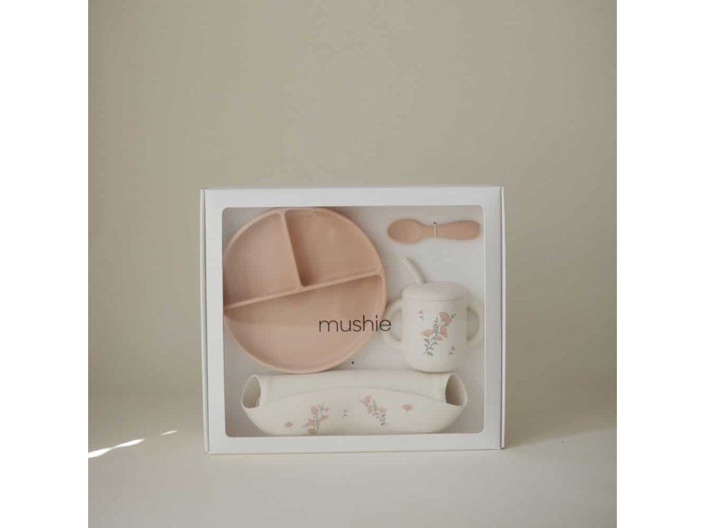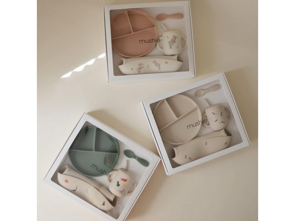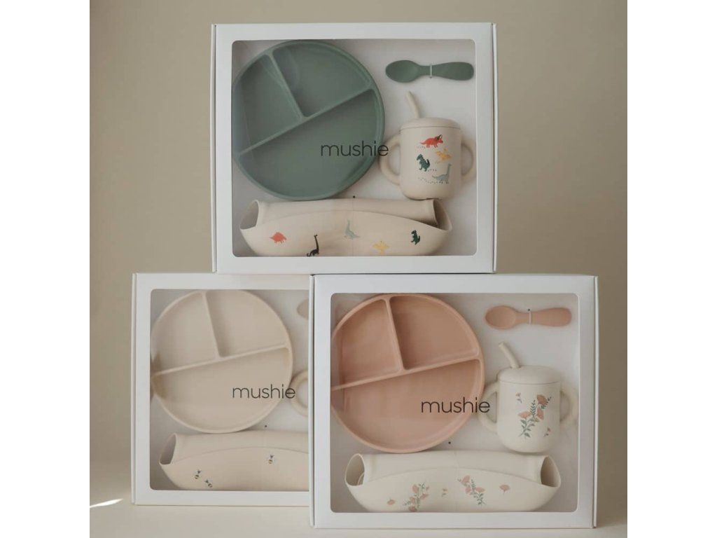 Mushie Silikónový jedálenský set pre batoľatá – detaily: