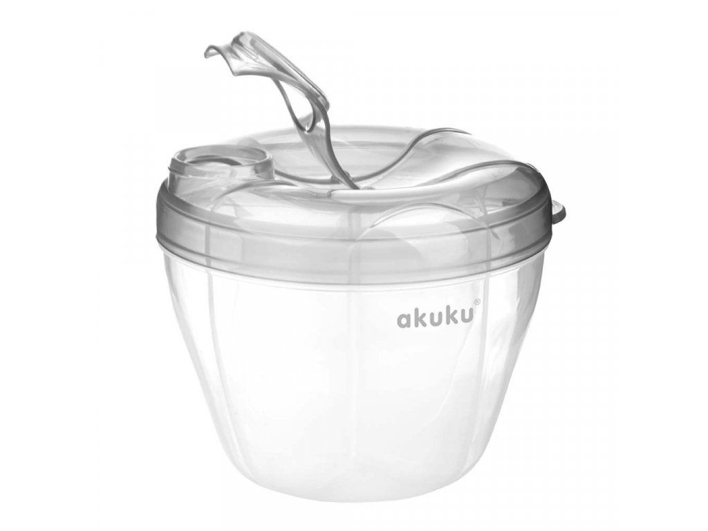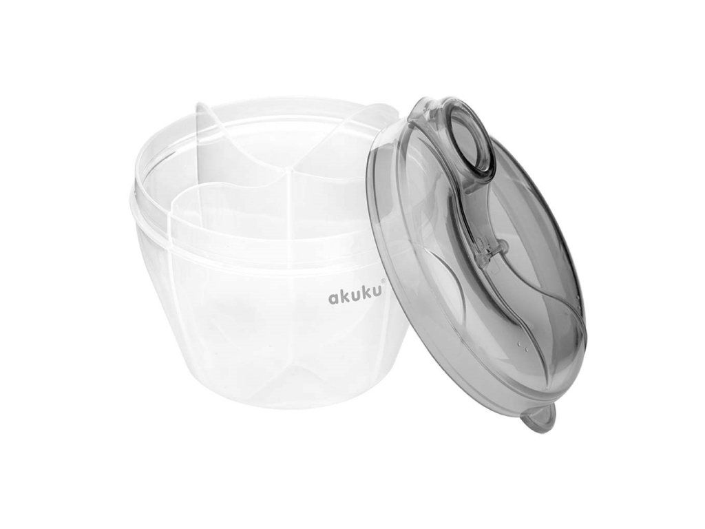 Dávkovač sušeného mlieka Akuku. Špeciálna nádobka s 4 samostatnými priehradkami, vďaka ktorým možno odmerať a pripraviť 4 dávky dojčenského sušeného mlieka. Nádobka je veľmi praktická predovšetkým pri prechádzkach a cestovaniu. Neobsahuje BPA. Priehradky možno vybrať a mať tak samostatnú misku. Vhodné pre deti od 0 mesiacov. Vhodné do umývačky riadu i sterilizátora.Dodatočné parametre