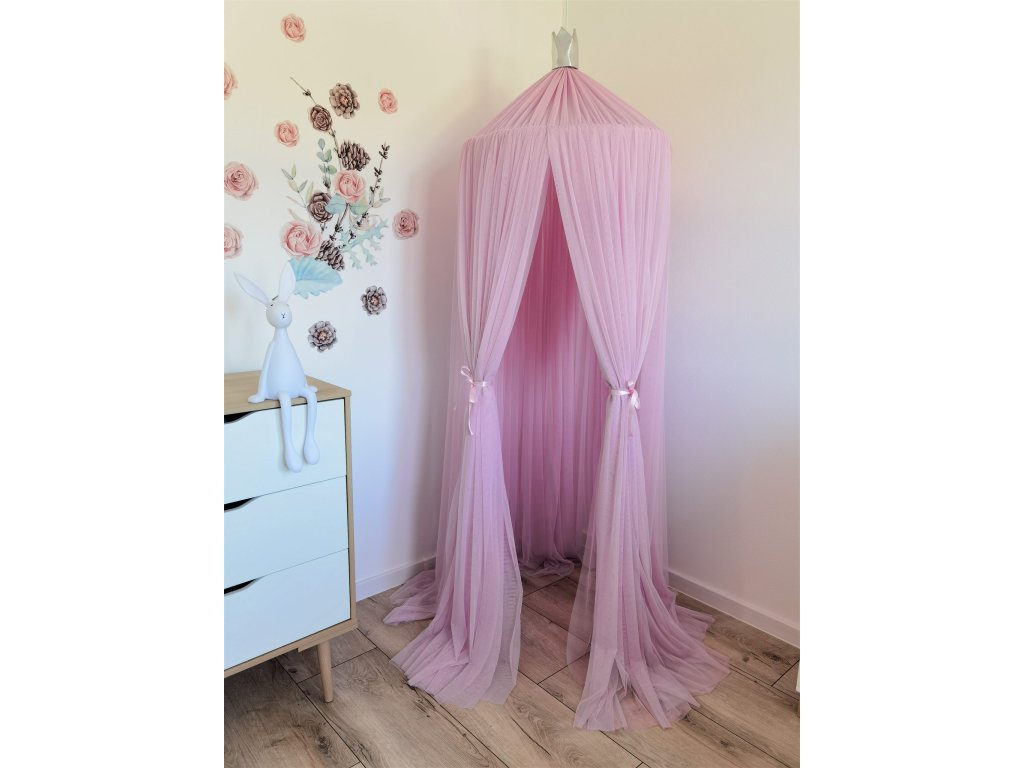 Tylový baldachýn Mia je nielen skvelou skrýšou v detských predstavách, ale aj unikátnym doplnkom, ktorý v detskej izbe vytvorí neopísateľnú atmosféru. Je výrazný a všimne si ho naozaj každý. Na prvý pohľad môžete spozorovať jeho kvalitný a krásny materiál, z ktorého srší romantickosť a roztomilosť, pričom však na druhej strane pôsobí štýlovo a elegantne. Môžete ho využiť na viacero spôsobov. Jedným z nich je umiestniť baldachýn nad postieľku, kde vytvorí prítmie, čo pozitívne vplýva na zdravý a pokojný spánok dieťatka. Druhou možnosťou je zavesiť ho do detského kútika nad hraciu podložku, čím sa vytvorí unikátne miesto na hranie, alebo čítanie rozprávok.