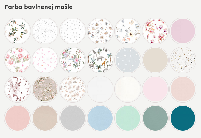 Biele kvety, Čierne bodky na bielom, Hviezdičky sivé na bielom, Les na bielom, Lúka, Magnólie, Mauve, Ruže, Ružové lupene, Ružovofialové kvety, Safari, Srdiečka biele na sivom, Svetlá béžová, Terrazzo, Tmavostaroružové kvety, Vintage ruže, Vetvičky, Biela, Smotanová, Baby ružová, Púdrová, Staroružová, Béžová, Svetlosivá, Modrá, Mintová, Starozelená, Tmavopetrolejová