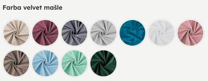 Farba velvet mašle : Svetlá béžová, Svetlá béžová, Tmavostaroružová, Stredne sivá, Svetlosivá, Petrolejová, Biela, Mauve, Piesková, Modrá, Mintová, Tmavozelená