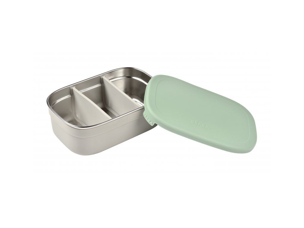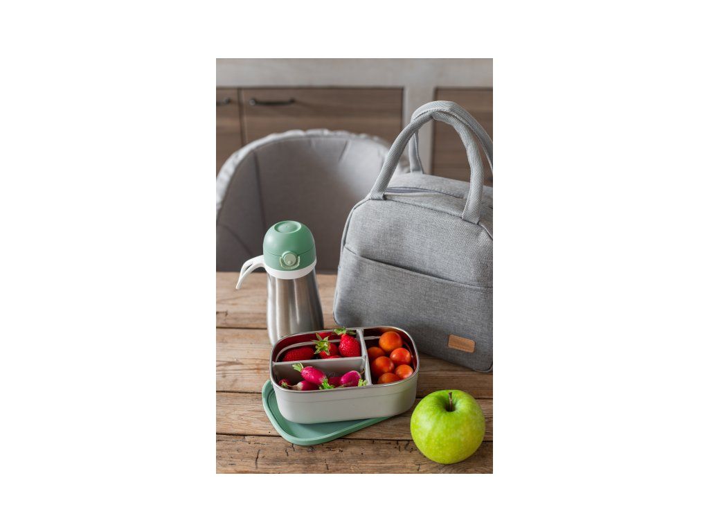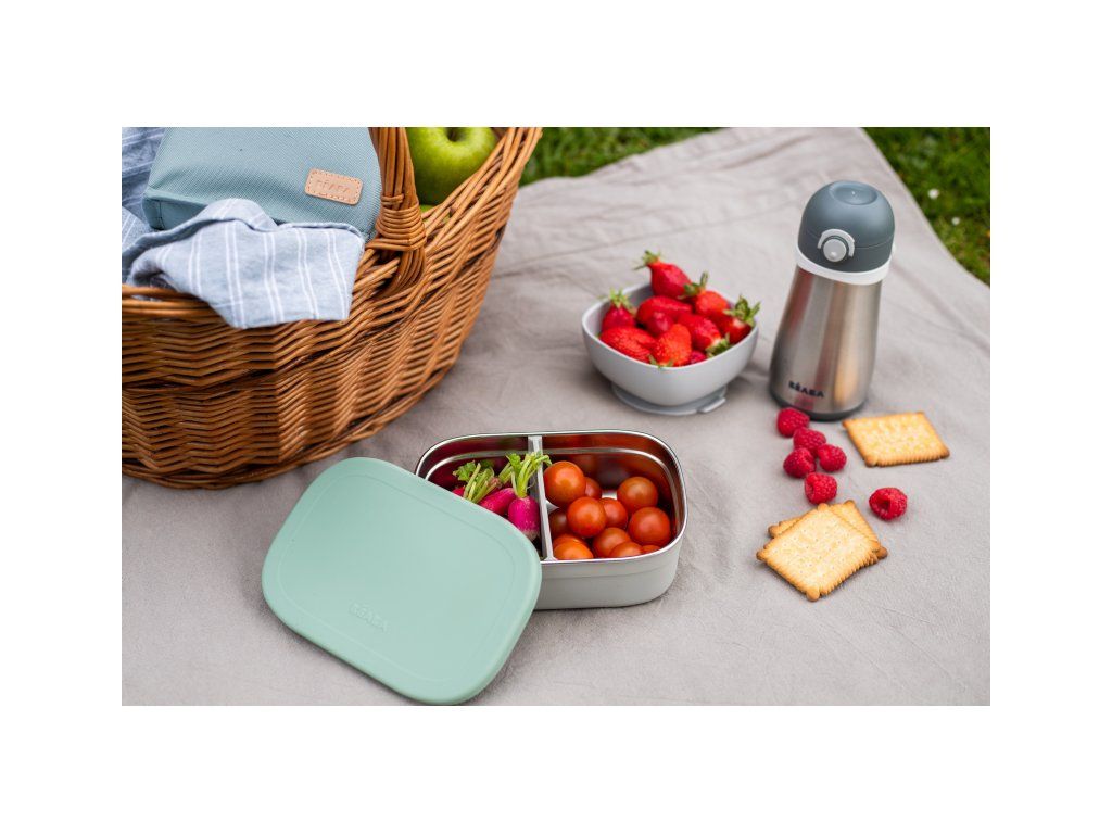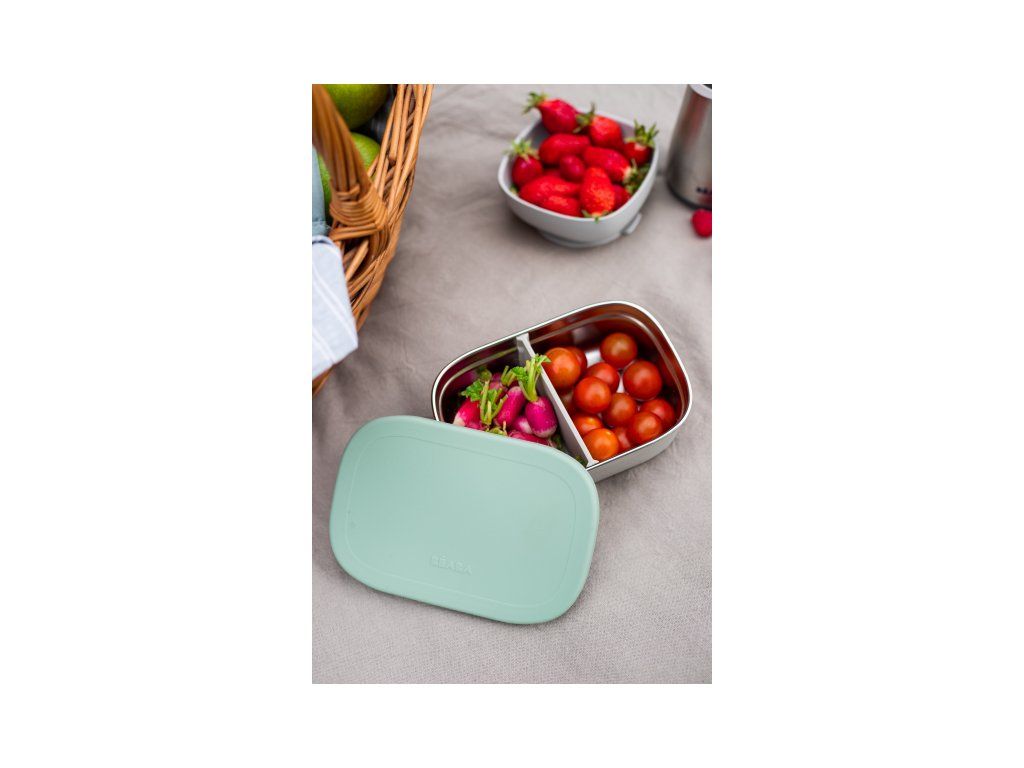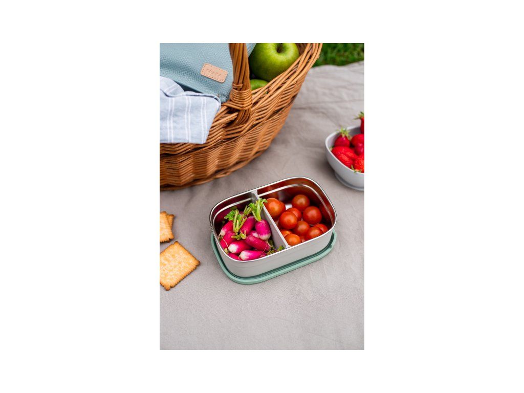 Nerezový desiatový box je ideálny na prenášanie a uchovanie detskej desiaty či obeda. Dve vnútorné odnímateľné silikónové prepážky umožňujú oddeliť jednotlivé časti desiaty. Silikónový odnímateľný poťah uľahčuje uchopenie a chráni box pred poškodením. Silikónové viečko bezpečne chráni obsah boxu.