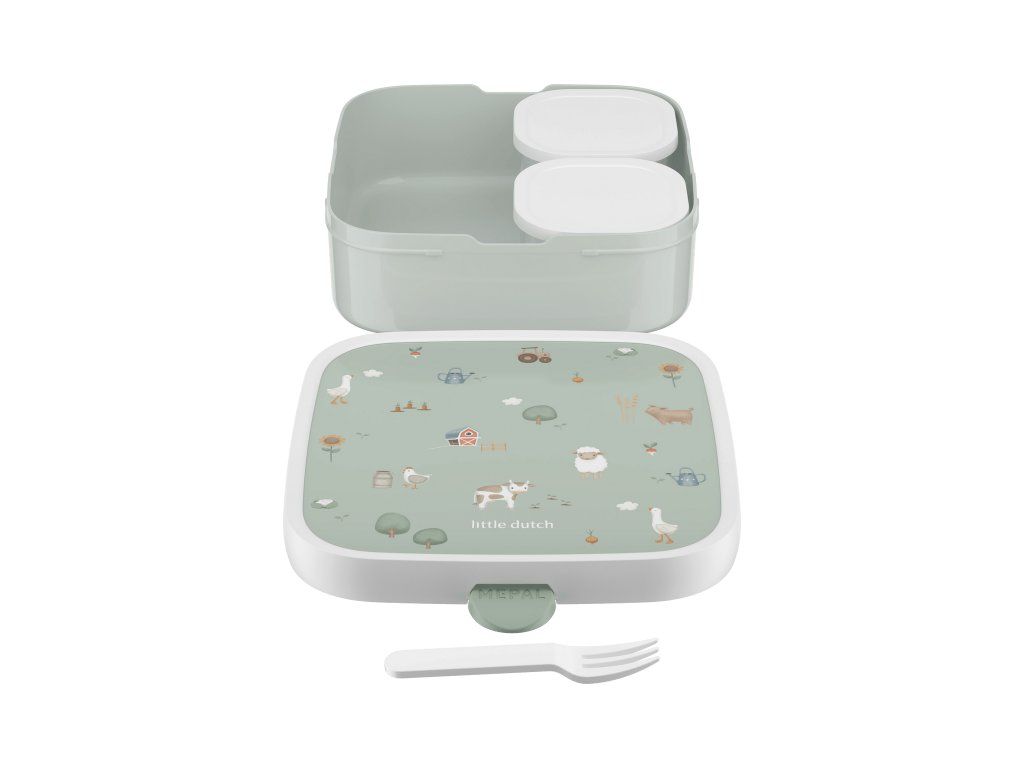 Veľký desiatový box má vo vnútri dve vyberateľné krabičky s viečkom na oddelenie jednotlivých častí uloženej desiaty. Súčasťou boxu je aj malá vidlička, ktorá je ideálna na napichovanie kúskov ovocia či zeleniny. Zacvakávací uzáver je zárukou bezpečného uzavretia obsahu boxu.