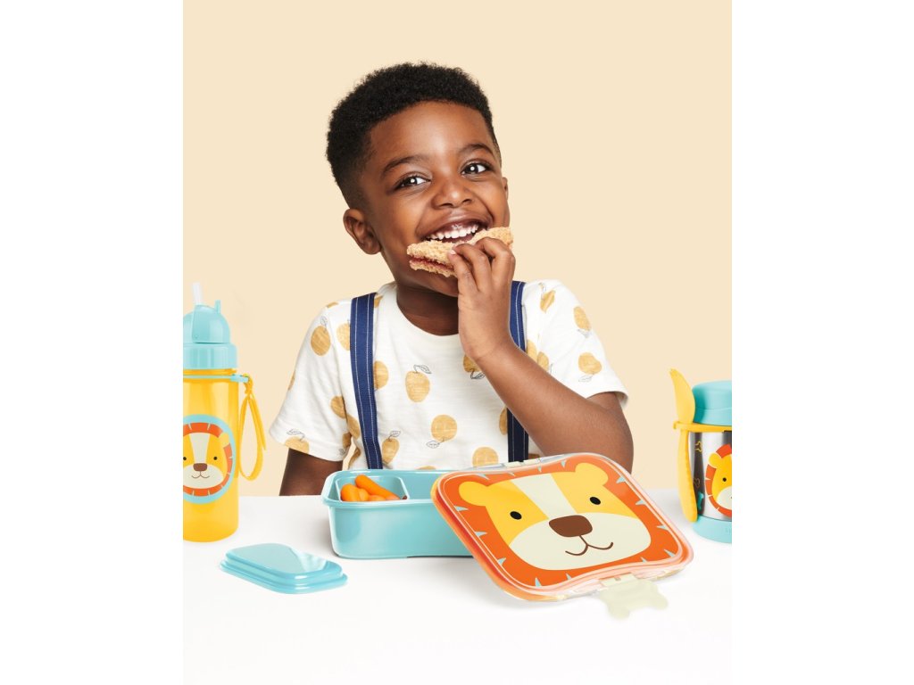 Vďaka veselým dizajnom, pomocou ktorých vyniknú malé osobnosti, si deti túto sadu „veľkého dieťaťa“ zamilujú. Je ideálna na nosenie jedla do škôlky, školy alebo na piknik v parku či pri cestovaní. Skvelá 4-dielna súprava na podporu nezávislého jedenia, obsahuje menšiu nádobu na občerstvenie a veko, ktoré sa úhľadne zmestí do krabičky na obed. Roztomilé klipy umožňujú, aby sa krabička ľahko otvorila, ale zároveň bola nepriepustná. Nakombinujte si produkty v rovnakom dizajne z celej kolekcie Zoo.Vlastnosti: