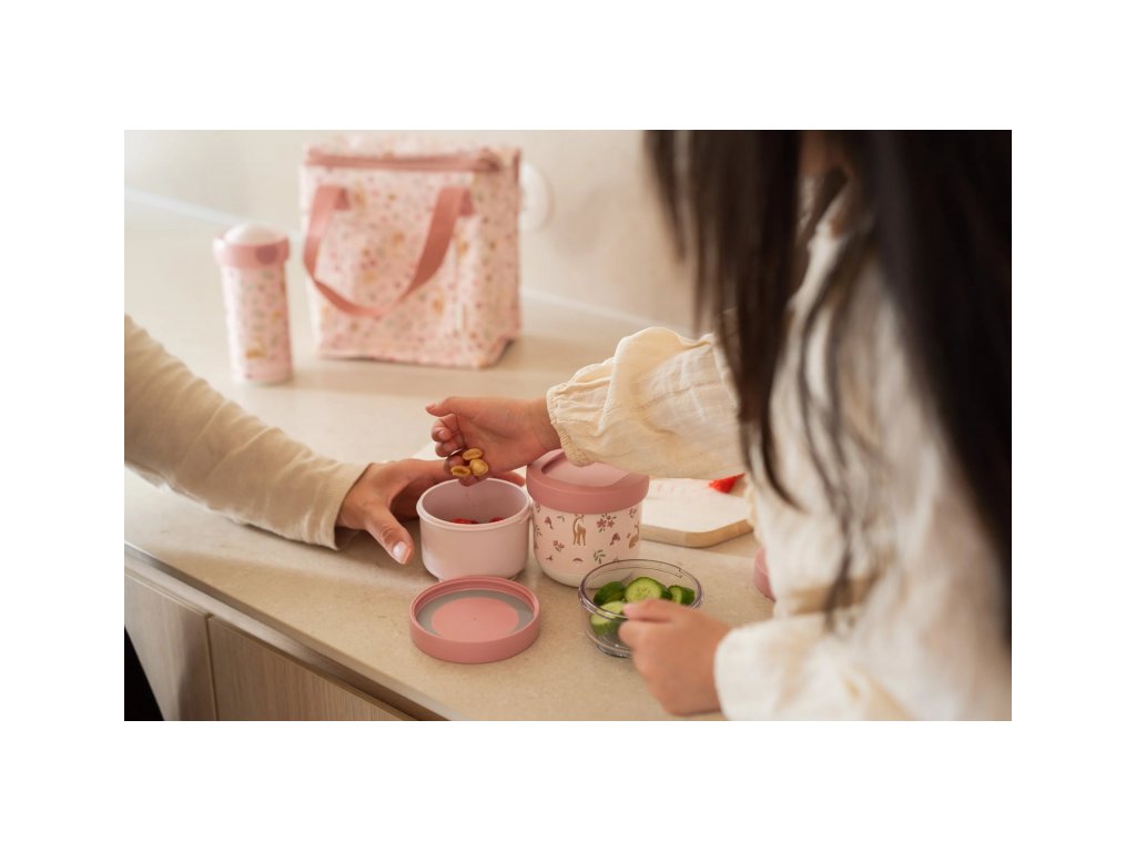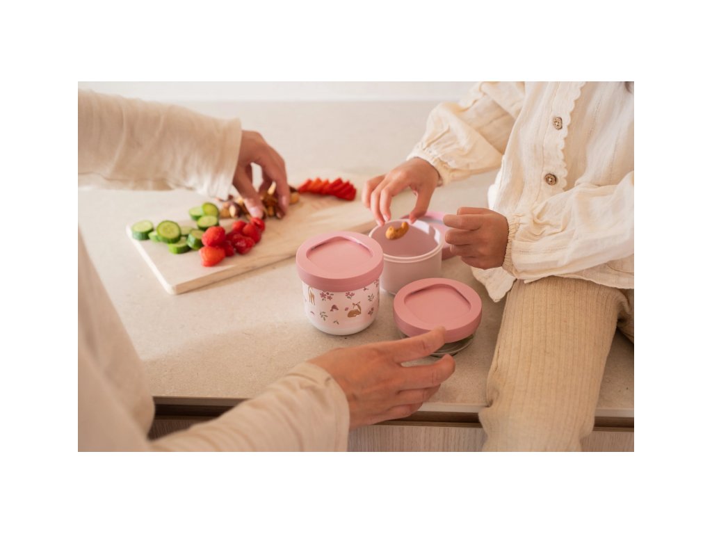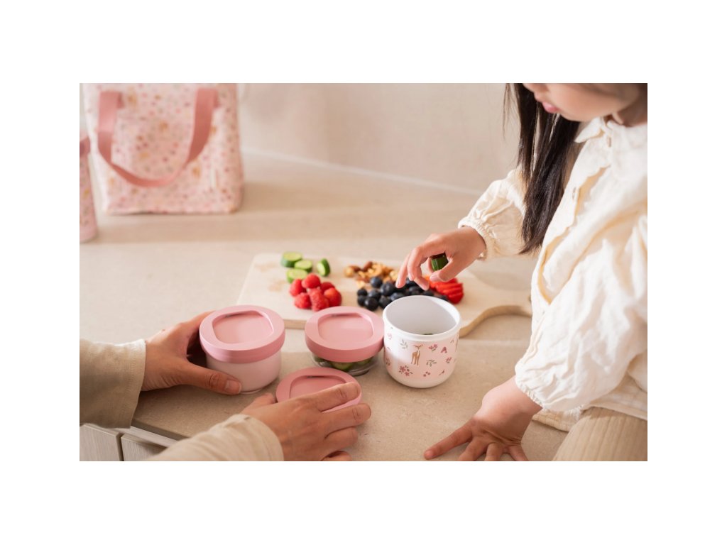 Tri praktické stohovateľné tégliky s viečkami sú ideálne na oddelené uloženie jednotlivých častí detskej desiaty. Spoľahlivé tesniace viečko chráni obsah pred vysypaním. Pre ľahké prenášanie sa tri tégliky pevne zacvaknú k sebe. Tégliky využijete na prechádzkach, výletoch aj doma.