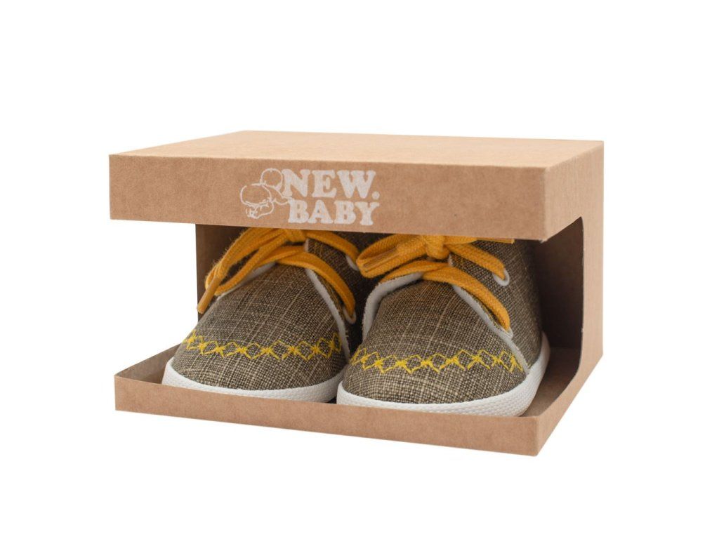 Dojčenské capačky New Baby pre bábätká. Krásne topánočky sú v štýle tenisiek s moderným vzhľadom na zaviazovanie na šnúrku. Topánočky priliehajú k nožičke a majú široké vnútro, čo umožňuje voľný pohyb prstov a svalov. Výrobok nie je určený na chôdzu. Sú veľmi ľahké s tenkou syntetickou podrážkou. Zloženie: 80% bavlna, 20% polyester. Podrážka: syntetický materiál. Dĺžka vnútornej stielky 10 cm. Určené pre deti 0-3 mesiacov. Vhodné pre chlapčekov i dievčatká. Dodávané v praktickej EKO krabičke. Upozornenie: pod textilnou vložkou sa nachádza papierová vložka, ktorá drží tvar capačky. Pred prvým použitím odstráňte túto papierovú vložku.Dodatočné parametre