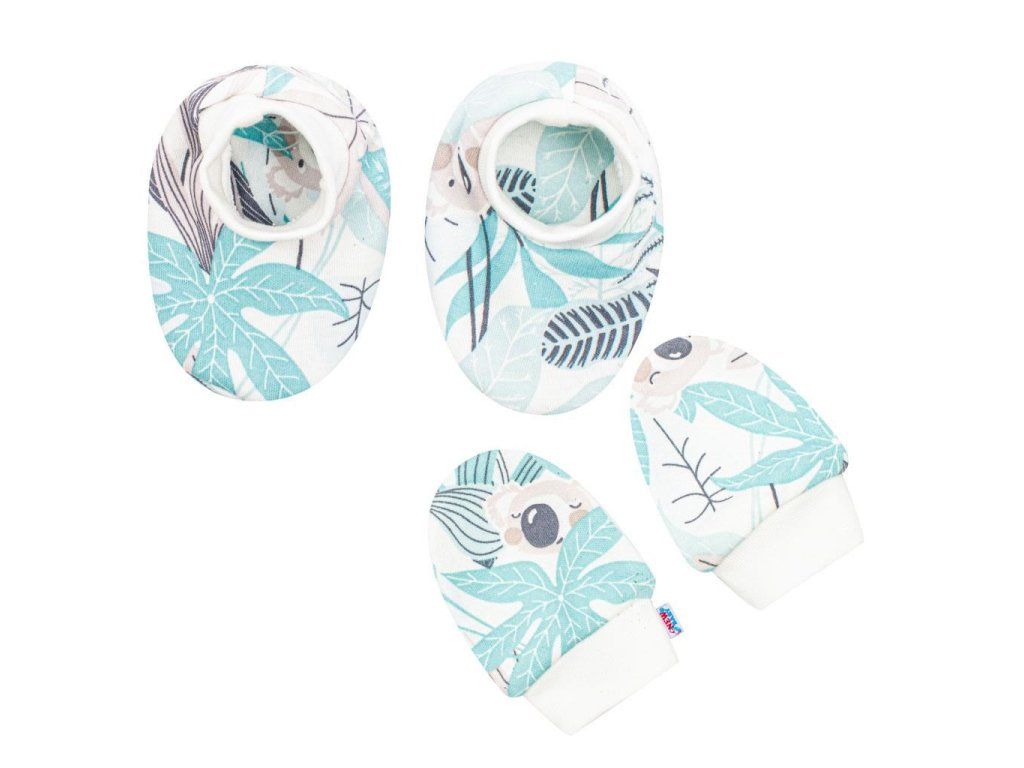 Krásny a praktický bavlnený set New Baby Lovely. Set sa skladá z capačiek a rukavičiek. Capačky a rukavičky sú zdobené roztomilým vzorom a majú sťahovacie manžetky. Zloženie: 100% bavlna.Dodatočné parametre