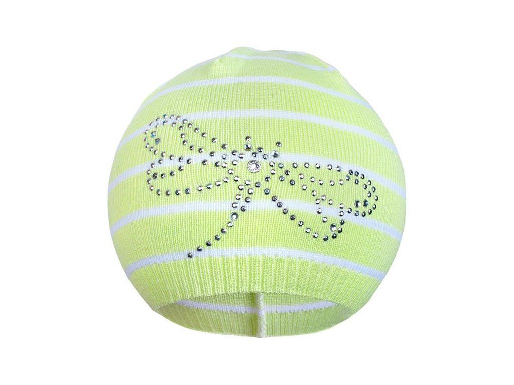 Jarná pletená čiapočka New Baby. Čiapočka je z úpletu a zdobí ju obrázok vážky, ktorý je ozdobený trblietavými kamienkami. Čiapočka je ušitá z priedušného materiálu, preto je vhodná pre jarné i jesenné dni. Materiál je pružný. Zloženie: 100% bavlna. Obvod okolo hlavičky cca 42-46 cm.Dodatočné parametre