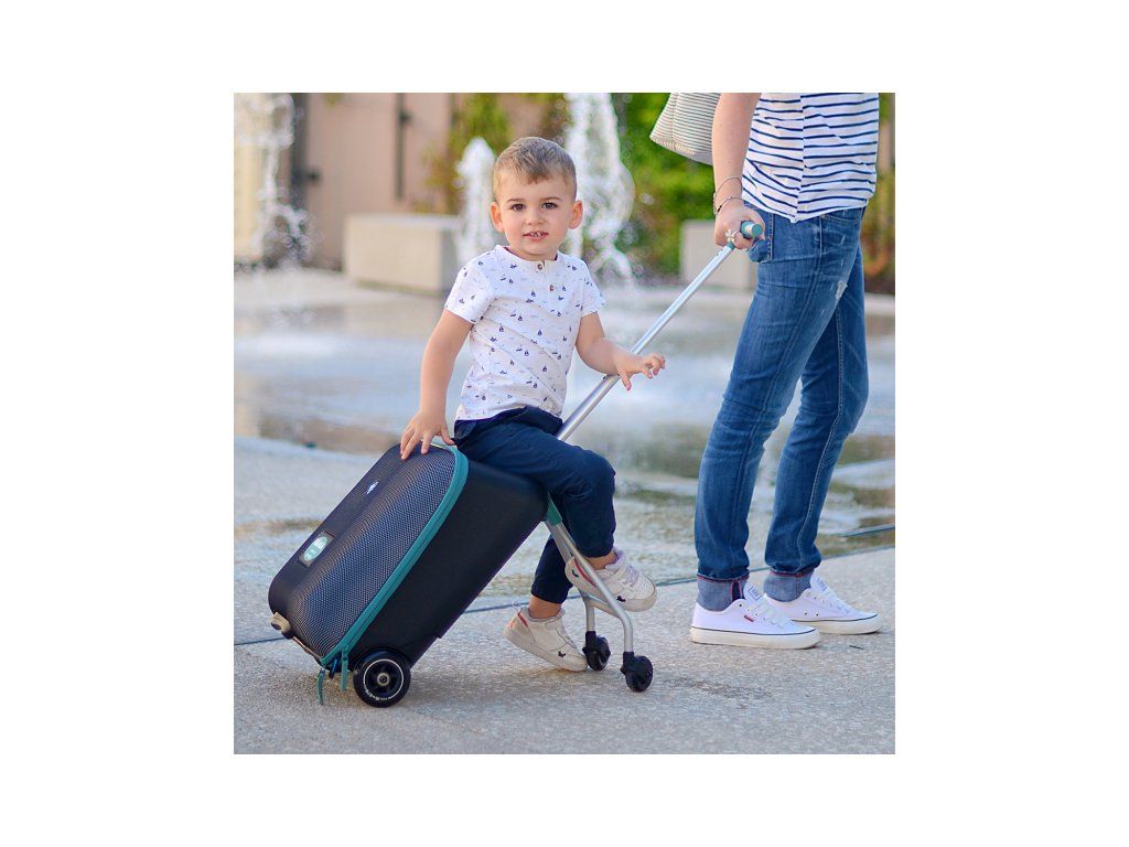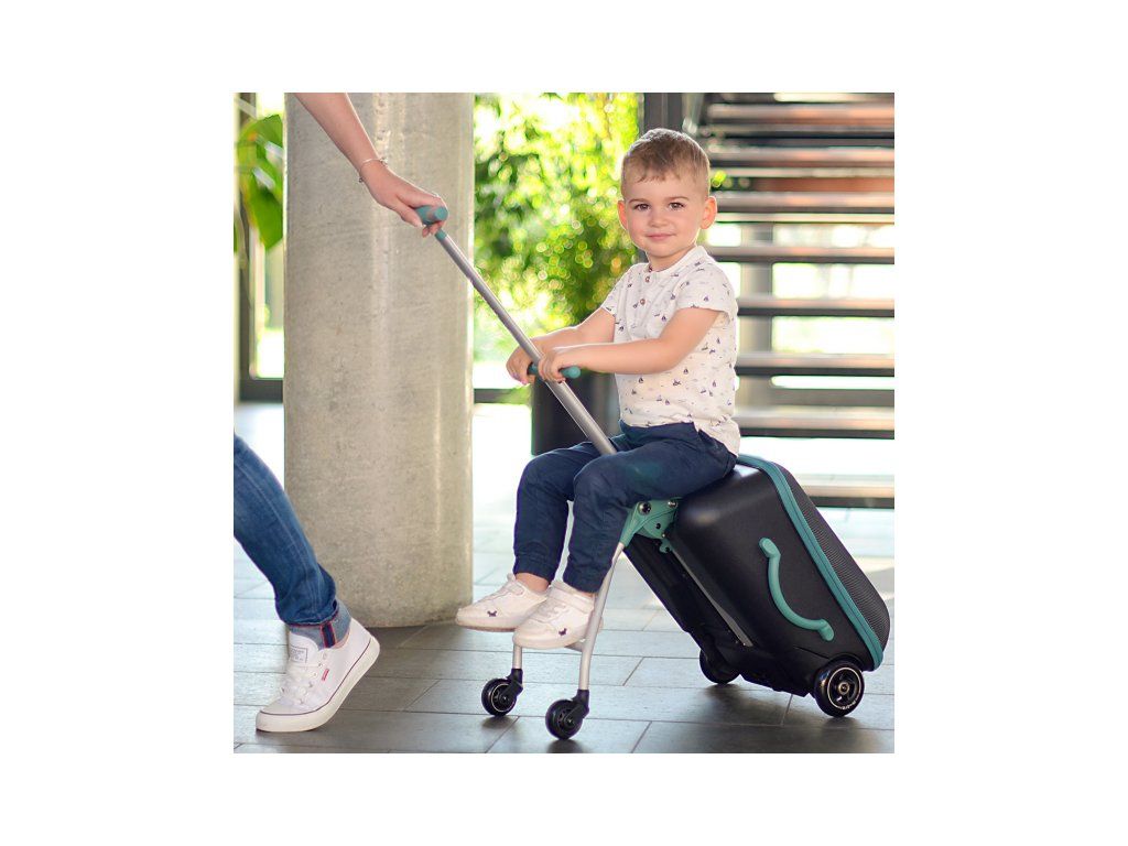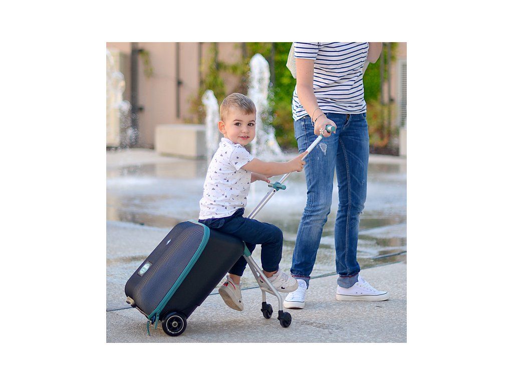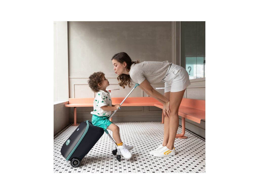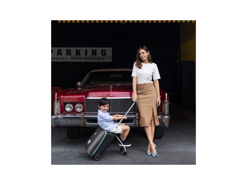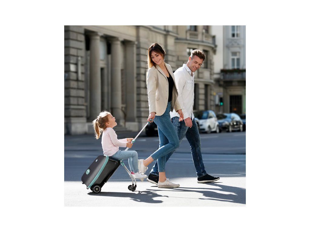 Unikátna kabínová batožina uľahčí a zrýchli vaše cestovanie s malým dieťaťom na letisku, na stanici a pod. Kufor je vybavený sedadlom, na ktorom môžete voziť sediace dieťa. Maximálnu stabilitu pri jazde so sediacim dieťaťom poskytujú vyklápacie oporné nohy s kolieskami. Vyťahovacie držadlo a predné kolieska otočné o 360 ° ponúkajú pohodlné ovládanie kufra.
