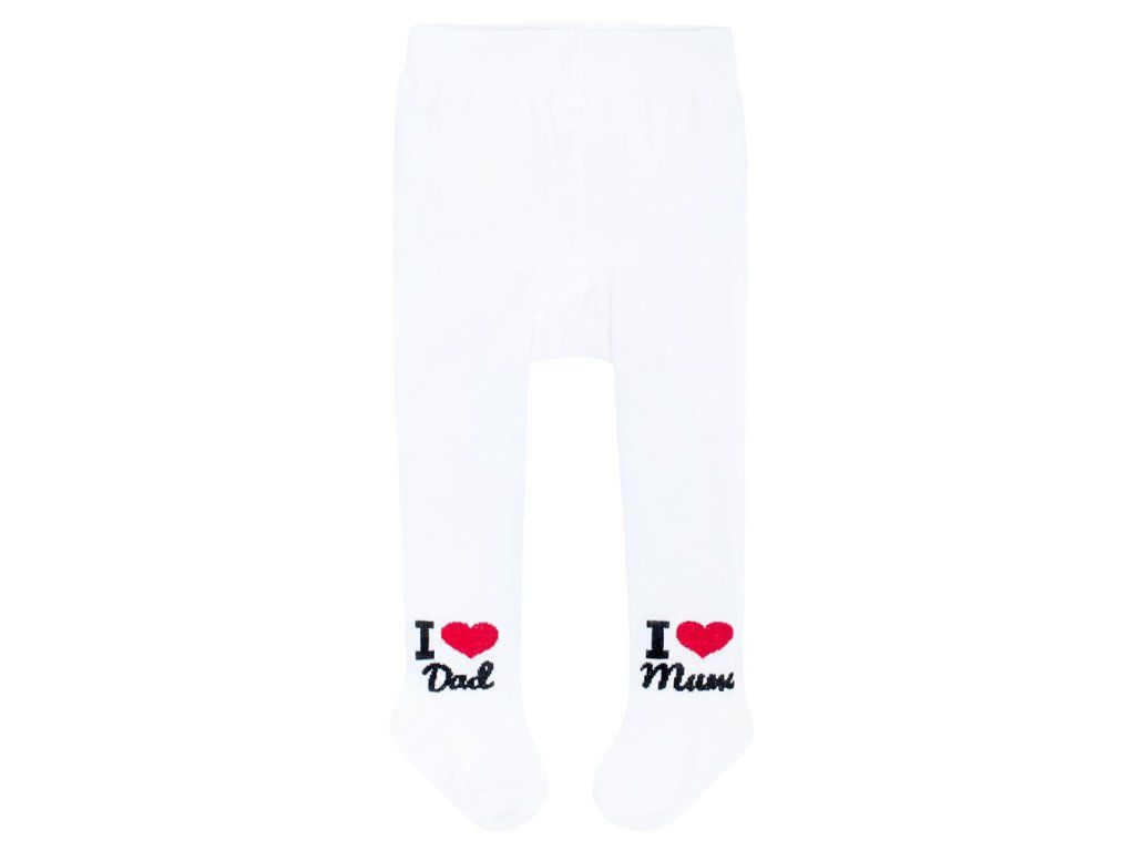 Bavlnené pančucháčky New Baby. Pančucháčky majú roztomilý obrázok na zadočku s nápisom I Love Mum and Dad. Na jednej nožičke je nápis I Love Mum a na druhej I Love Dad. Sú vyrobené z kvalitného materiálu, ktorý nepúšťa farbu a drží tvar. Pančucháčky sú veľmi praktické a pristanú všetkým malým deťom. Zloženie: 80% bavlna, 16% polyamid, 4% elastan. Veľkosť 56-62.Dodatočné parametre