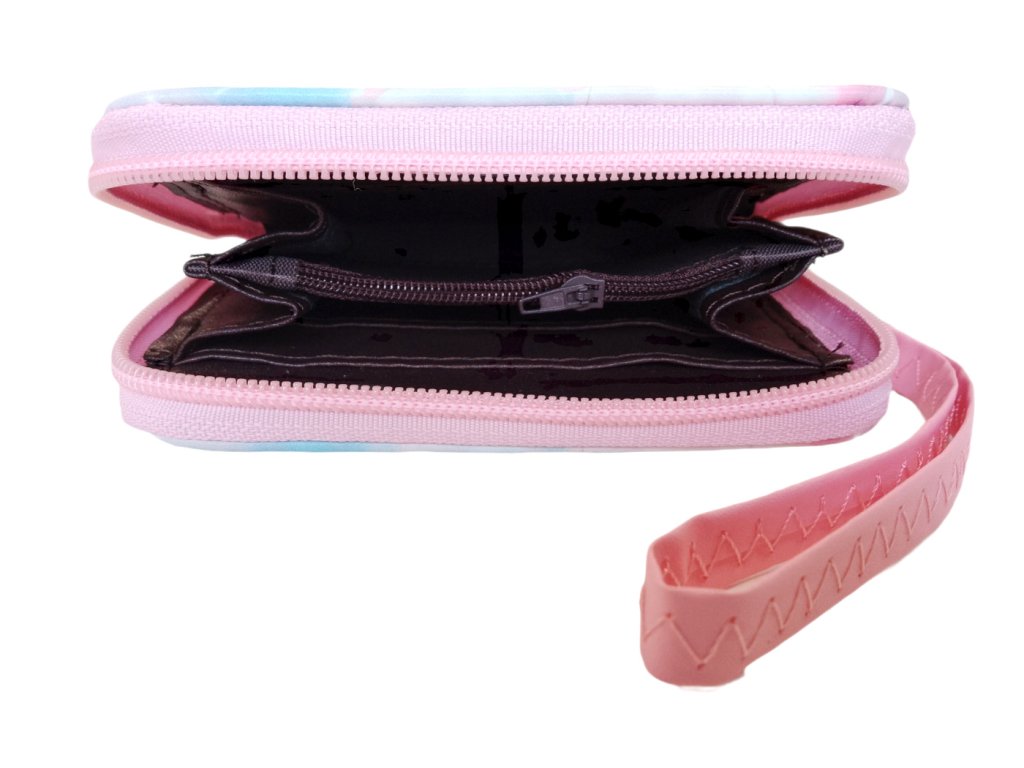 Peňaženka je vyrobená z odolného syntetického materiálu, ktorý je príjemný na dotyk a zároveň dobre chráni obsah vo vnútri. Ružové pútko umožňuje pohodlné nosenie na ruke, zatiaľ čo zlatá karabína ponúka možnosť pripnutia peňaženky na batoh alebo opasok. Zips v hornej časti bezpečne uzatvára vnútorný priestor.