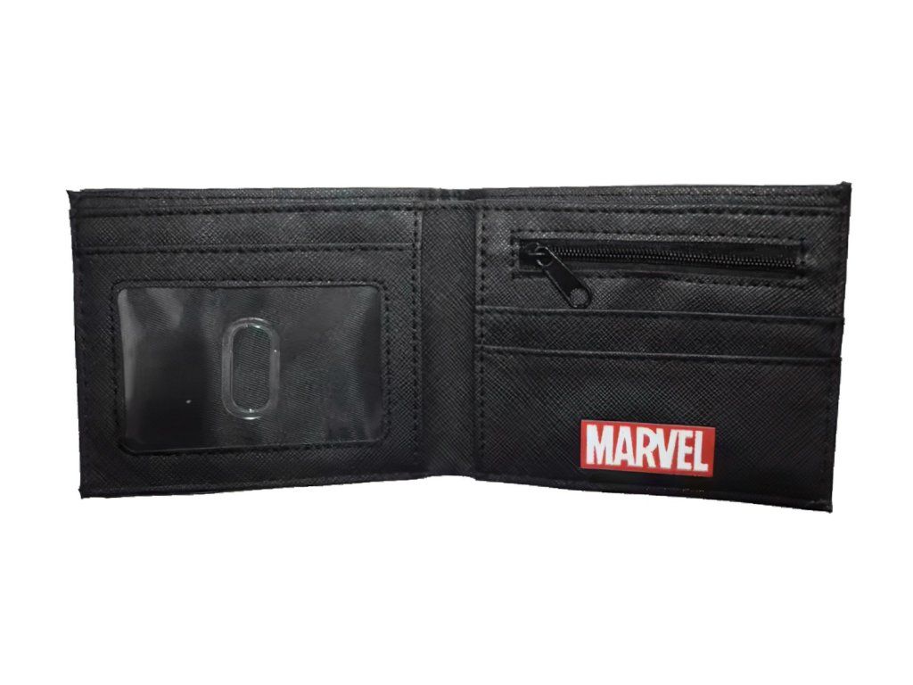 Peňaženka je vyrobená z odolného syntetického materiálu, ktorý dobre imituje kožu, ale zároveň je ľahký a ľahko sa udržiava. Vnútorný priestor je prakticky členený – obsahuje vrecko na mince so zipsom, priehradky na bankovky, sloty na karty a priehľadné vrecko na doklady. Logo Marvel v červenej farbe sa nachádza na zadnej aj vnútornej strane.