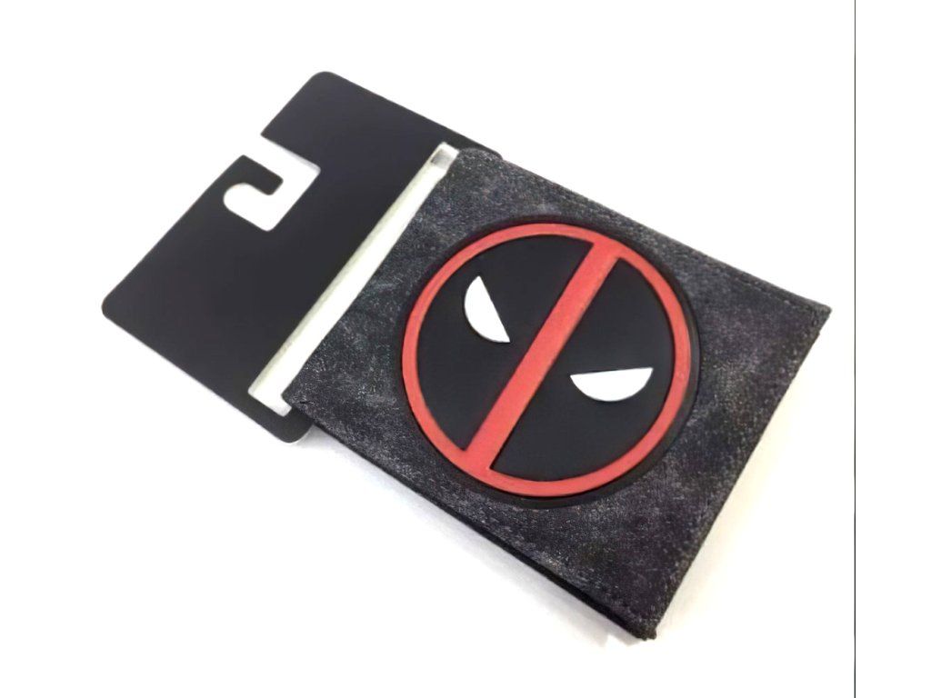 Na prednej strane sa nachádza vystúpené 3D logo Deadpoola – čierny kruh s červeným lemovaním a výraznými bielymi očami. Potlač je zasadená do tmavého, mierne matného pozadia, ktoré dodáva peňaženke drsný, takmer komiksový vzhľad.