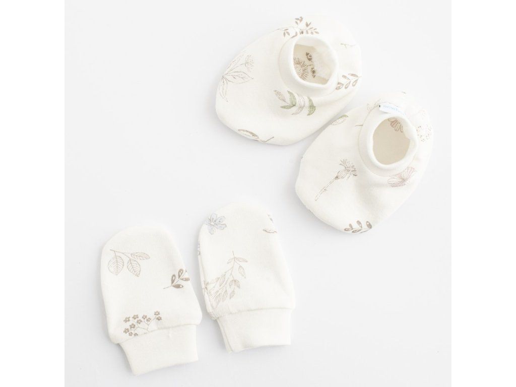 Krásny a praktický bavlnený set New Baby Zoe. Set sa skladá z capačiek a rukavičiek. Capačky a rukavičky sú zdobené potlačou kvetín a majú sťahovacie manžetky. Zloženie: 100% bavlna.Dodatočné parametre