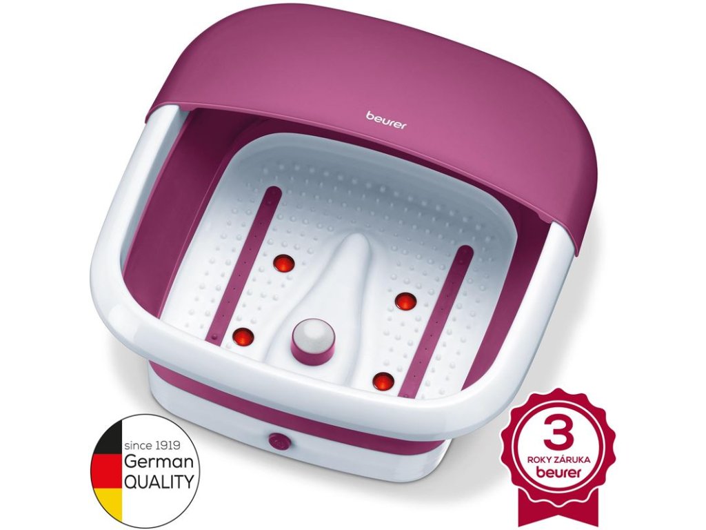 Masážna vanička na nohy od nemeckej značky BEURER FB30 s možnosťou rozloženia. Doprajte vašim nohám kvalitnú vibračnú alebo bublinkovú masáž alebo upokojujúcu masáž. Má protišmykové gumové nožičky, pre lepšiu stabilitu. Relaxujte masážou nôh v teplej vode hoci aj každý deň.Masážny prístroj Beurer FB 30 na nohy je skvelým pomocníkom ako pre domáce pedikúru, tak pre profesionálnu starostlivosť o nohy v kozmetickom salóne. Poskytuje príjemnú masáž nôh a pomáha zmäkčovať kožu na chodidlách a pätách pre dokonalú pedikúru. Ponúka vám tri funkcie, a to vibračná masáž, bublinkovú masáž a upokojujúce ohrev vody. Nechýba ani infračervené svetlo pre upokojenie a uvoľnenie nahromadeného stresu. Prístroj je vhodný pre rôzne veľkosti nôh až do pánskej veľkosti č. 45.Medzi hlavné prednosti patrí: príjemná masáž nôh, 3 funkcie - vibračná masáž, bublinková masáž a upokojujúci ohrev vody, uvoľňujúce infračervené svetlo, ochrana proti rozstrekovaniu vody, gumové nožičky a bohaté príslušenstvo na pedikúru a pemza. Masážny prístroj na nohy vyniká svojím moderným a funkčným dizajnom fialovo-bielej farby. Je veľmi skladný, môžete ho ľahko zložiť, čím ušetríte miesto a priestor. Disponuje ochranou proti rozstrekovaniu vody a navíjačom šnúry s upevnením. Pre väčšiu stabilitu je opatrený gumovými nožičkami. V balení tiež nájdete praktické príslušenstvo na pedikúru a pemzu na päty. Rozmaznávajte svoje nohy po namáhavom dni a doprajte im uvoľňujúcu masáž a luxusnú starostlivosť.Charakteristika a technické údaje:možnosť zložiť - šetrenie miesta3 funkcie: vibráčná masáž, perličkovámasáž, dohrievanieinfračervené svetloprotišmykové nožičkynavíjanie káblaaž do veľkosti topánok 45príkon: 60WNohy hrajú v našich životoch "základnú úlohu", celá naša váha spočíva na nich. Naše nohy pozostávajú z 26 kostí, 22 kĺbov a 107 väzov pre každú nohu. Obzvlášť bublinkový kúpeľ je ideálny pre ľudí, ktorí sú na nohách po celý deň. Prísady levandule, alebo tymiánu uvoľnia svalstvo nôh a obnovia ho.Vedeli ste, že teplota vody má rôzne účinky? Teplý vodný kúpeľ je užitočný na uvoľnenie svalov na nohách, stimuluje cirkuláciu, pomáha proti studeným nohám a tiež zmierňuje bolesť chrbta. Na druhej strane, kúpeľ v studenej vode je ideálny na boj proti bolestiam hlavy, zvyšuje nízky krvný tlak, pomáha pri prerušovanom spánku a neaktívnom pohybe čriev. Urobte správny krok k väčšej pohode a k lepšiemu zdraviu. Vyskúšajte si to s jedným z masážnych prístrojov na nohy od kvalitného nemeckého výrobcu Beurer!Klikni video.Dodatočné parametre