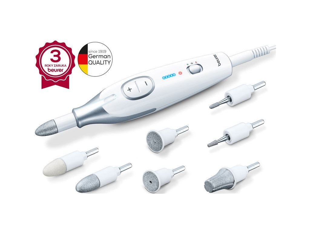 Profesionálna sada BEURER MP 42 na manikúru a pedikúru je neoceniteľným pomocníkom žien, ktoré dbajú na svoju krásu a túžia byť upravené v každej situácii.Ergonomický dizajn zabraňuje skĺznutiu počas používania a môžete si vybrať až zo 7 zafírových nástavcov. Špecializované nástavce sú vhodné ako na úpravu nechtov na rukách a nohách ako aj na odstraňovanie zrohovatenej kože alebo odstránenie mozoľov či kurieho oka. Nechty si krásne opilníkujete, v prípade nechtov na nohách sa zbavíte nevzhľadnej hrubosti a následne povrch nechtov krásne vyleštíte aby bol hladký, jemný a závideniahodný. Okolie nechtov si ošetríte zafírovým kužeľom a už vám nič nebráni pochváliť sa vašim novým a krásnym ja! Charakteristika a technické údaje: Priebežne nastaviteľný V smere hodinových ručičiek / proti smeru hodinových ručičiek So 7 vysokokvalitnými nadstavcami pre starostlivosť o nechty a pokožku Magic LED displej - zobrazí sa len počas prevádzky Pre nechty rúk a nôh Ochranný kryt pre prach z nechtov S jasným LED svetlom Ergonomický dizajn 7 vysoko kvalitných zafírových a plstených nadstavcov: 1. Zafírový kužeľ: odstránenie suchej kože alebo zatvrdnutej kože z chodidiel a päty nôh a na manikúru nechtov 2. Zafírový disk, jemné: plnenie a ošetrenie nechtov, jemné zrno 3. Zafírový disk, hrubý: plnenie a ošetrenie nechtov, hrubé zrno 4. Zafírový callus rasp: rýchle odstránenie hrubých alebo veľkých kusov stvrdnutej pokožky z podošvy a z päty 5. Fréza: na odstraňovanie zarastených nechtov 6. Valcový frézovací žľab: brúsenie a vyhladzovanie lignifikovaných povrchov nechtov 7. Plstený kužeľ: vyhladzovanie a leštenie okraja nechtov po naplnení, ako aj na čistenie povrchu nechtov Vrátane úložného vreckaProdukty MP od nemeckej spoločnosti Beurer sú zárukou kvality a spoľahlivosti. MP 42 ponúka okrem iného aj ‘‘Magic LED displej‘‘, ktorý sa zobrazí len počas prevádzky. Dodávaný je aj s úložným vreckom, do ktorého môžete jednoducho uložiť všetko príslušenstvo a zobrať si ho kdekoľvek na cesty.Klikni video.Dodatočné parametre