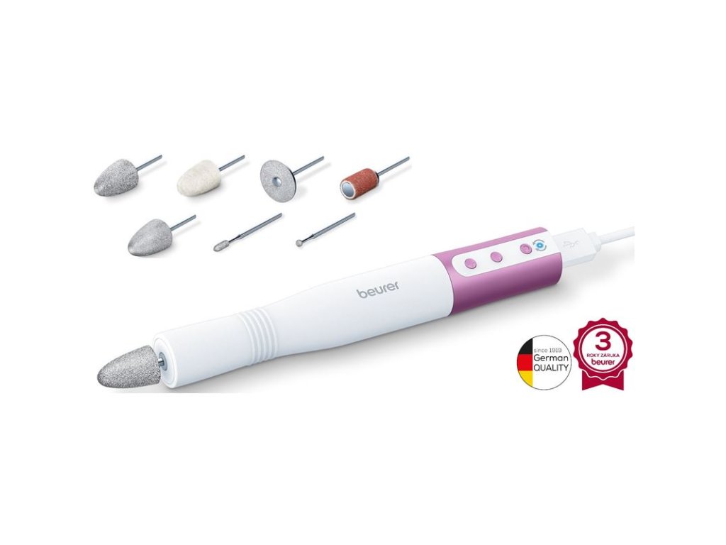 Extra tenká sada na manikúru a pedikúru BEURER MP52 zaistí, že vaše ruky budú skutočne pútavé. Ergonomický tvar vám pohodlne padne do ruky, čo vám umožní presne opilovať nechty. Sedem rôznych nástavcov vyrobených zo zafíru a plsti zaisťuje dobre upravený a úhľadný výsledok. Po zvyšok času môžu byť všetky nástavce úhľadne uložené v úložnom vrecku. Aby vaše ruky a nohy vyzerali krásne, aj keď ste na cestách.Charakteristika a technické údaje:Super tenký dizajn pre presné tvarovanie a pilníkovanie nechtovV balení 7 vysokokvalitných nástavcov: 1. Zafírové koliesko jemné: Vhodné na pilníkovanie a úpravu nechtov. 2. Zafírový kužeľ, jemný: Vhodný na odstránenie suchej kože, mozoľov na chodidle a päte a ošetrenie nechtov. 3. Zafírový kužeľ, hrubý: Vhodný na rýchle odstránenie tvrdej kože a veľkých mozoľov na chodidle a päte. Tento nástavec je určený na aplikáciu na veľké plochy. 4. Plstený kužeľ: Vhodný na vyhladenie a vyleštenie končekov nechtov po pilovaní a na čistenie povrchu nechtov. 5. Plamienková fréza: Vhodná na odstraňovanie zarastených nechtov. 6. Zafírový vykrajovač, okrúhly: Vhodný na starostlivé odstraňovanie kurích ôk. 7. Nástavec na používanie nástavcov na brúsny papier: Vhodné na montáž nástavcov na brúsny papier. V balení 10 jednorazových brúsnych hrotov na odstraňovanie suchej kože, mozoľov alebo mozoľov na chodidlách a pätách a ošetrenie nechtov.Plynule nastaviteľné s otáčaním v smere a proti smeru hodinových ručičiekVýkonný profesionálny motor s maximálnym výkonom až 15 000 ot./min.V balení: úložná taška a kábel USB-C s adaptéromVhodné pre diabetikovSieťová prevádzkaVstup: 100-240 V, 50/60Hz; 0,5 A MaxVýstup: 5,0 V 2,0 A; 10,0 WRýchlosť: 6 000 ot./min. – 15 000 ot./min. ± 15 %Nastavenia rýchlosti: KontinuálneRozmery produktu (D x Š x V): 142 x 21 x 18 mmHmotnosť produktu: cca. 52,5 gCE: ánoZáruka: 3 rokyManikúrové a predikúrové produkty od nemeckej spoločnosti Beurer sú zárukou kvality a spoľahlivosti. MP52 ponúka okrem iného aj jasné plynulé nastavenie rýchlosti pre dôkladnejšie ošetrenie nechtov. Dodávaný je aj s úložným boxom, do ktorého môžete jednoducho uložiť všetko príslušenstvo a zobrať si ho kdekoľvek na cesty.Dodatočné parametre