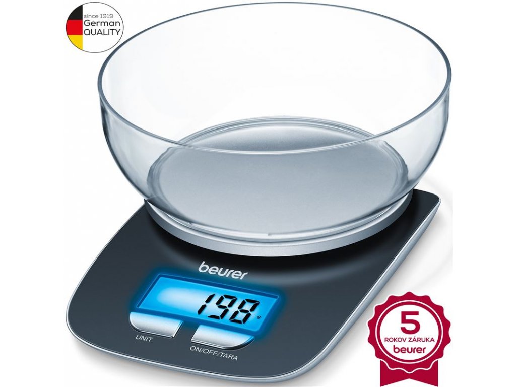 Váha kuchynská digitálna BEURER KS 25Charakteristika a technické údaje: dizajnová váha s miskou čierna/sklo modrý, veľký podsvietený LCD displej kapacita max 3 kg rozlíšenie 1 g funkcia TARA automatické vypínanie indikátor preťaženia voľba jednotiek g/kg/oz/lb miska vhodná do umývačky 14,2 mm priemer rozmer: 22 x 15 x 5 cm batérie súčasťou baleniaDodatočné parametre