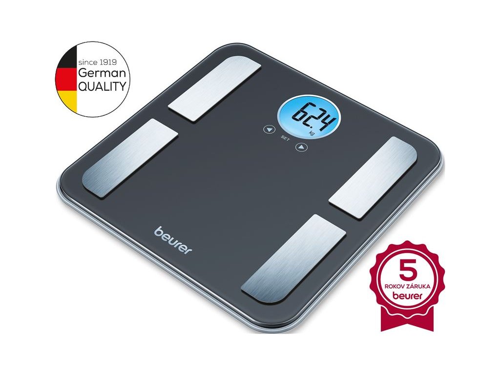 Osobná diagnostická váha Beurer BF 220 od nemeckej spoločnosti Beurer je určená pre všetkých milovníkov čístého dizajnu v kombinácií skla a nerezu. Váha má XL važiacu plochu 31 x 31 cm, ktorá je tvorená 8 mm hrubým bezpečnostným sklom. Navyše má na modro podsvietený okrúhly displej - úžasne čitateľný. Váha ďalej ponúka 5 úrovní aktivity a 10 užívateľských pamätí. Kapacita je úžasných 180 kg!Dostatočné cvičenie, zdravá výživa a hmotnosť, pri ktorej sa dobre cítite - sú nevyhnutné pre vaše zdravie. Široký sortiment váh od osobných digitálnych, cez dizajnové váhy až po diagnostické váhy. Tie všetky Vám pomôžu dosiahnuť alebo udržiavať zdravú hmotnosť.Hmotnosť je problémom zdravia. Veľa ľudí má nadváhu. Je to spôsobené zmenou okolností, menej fyzických aktivít alebo nadbytok vysoko kalorických potravín. Avšak podváha je tiež rizikovým faktorom. Pravidelná kontrola hmotnosti je preto veľmi dôležitá.Charakteristika a technické údaje: atraktívny, guľatý LCD displejna modro podsvietený displejmoderné prevedenie - rámy28 mm výška číslicvážiaca plocha z bezpečnostného sklaelektródy z brúsenej ušľachtilej ocelemeranie telesnej hmotnosti, tuku, vody, hustota svalovej, kostnej hmoty, kalórie (AMR)- 0,1% analýza telesného tuku, vody a svalovej hustoty- 100 g telesnej hmotnosti a kostnej hmotyjednotky kg / lb / st10 užívateľských pamätí5 úrovní aktivityautomatické zapnutie a vypnutierozmer 30 x 30 cmkapacita: 180 kgpresnosť: 100 gindikácia preťaženiaDodatočné parametre