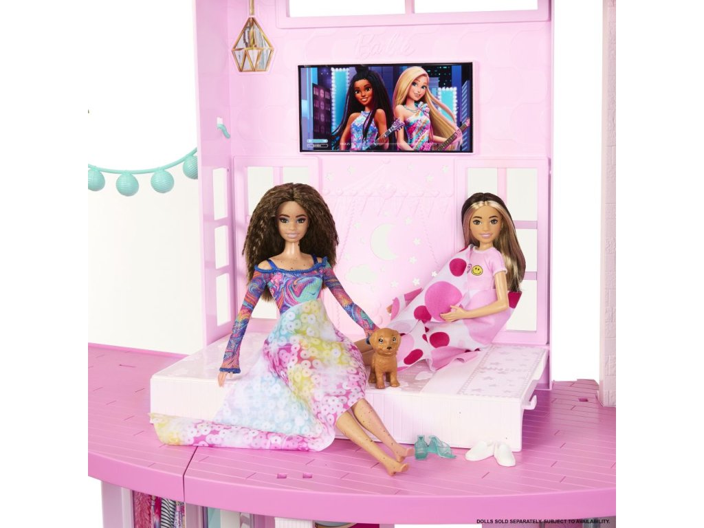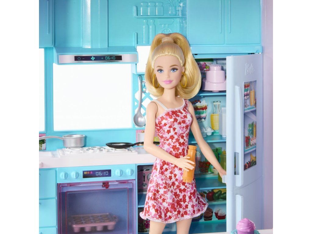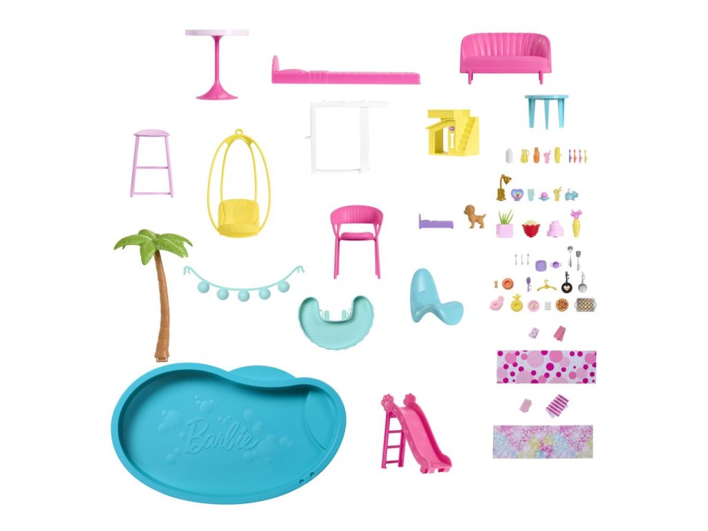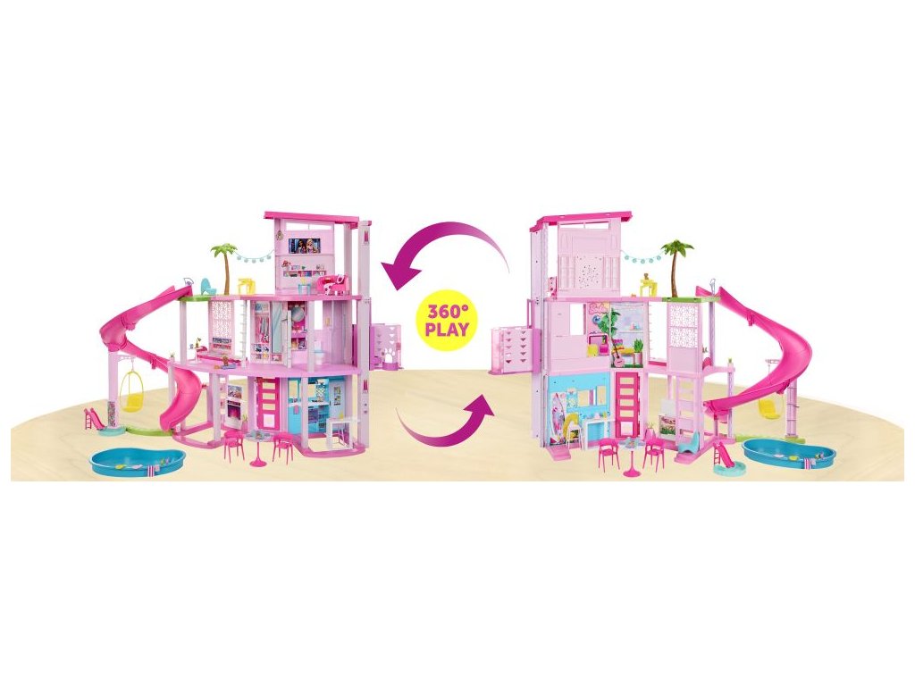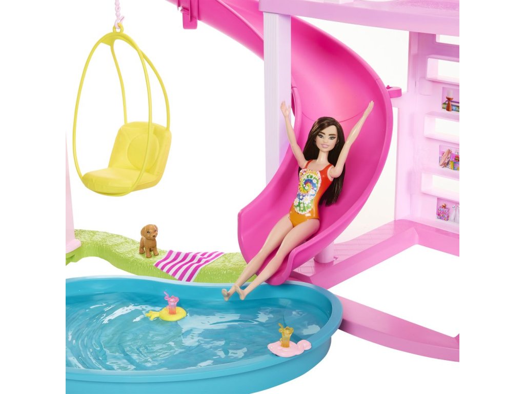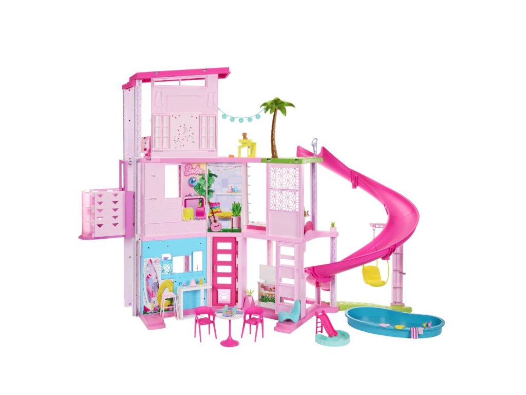 Deti môžu usporiadať dokonalú párty pri bazéne s Barbie® Domom snov™! Tento luxusný dom pre bábiky má najvyššiu šmykľavku v doterajšej sérii domov Barbie® a trojposchodovú špirálovú konštrukciu pre nekonečnú zábavu na slnku. Inšpiruje na hranie v rozsahu 360 stupňov vďaka širokému a priestrannému pôdorysu, trom podlažiam a 10 vnútorným a vonkajším obytným priestorom. Herný set obsahuje tiež viac prvkov pre domácich miláčikov ako kedykoľvek predtým, vrátane šmykľavky pre šteňatá a bazéna, kde sa chlpatí kamaráti môžu hrať spolu s bábikou Barbie®! Extra miestnosť na hornom poschodí sa premení na spaciu izbu, vďaka ktorej sa v Dome snov™ môžu vyspať štyri bábiky (bábiky Barbie® nie sú súčasťou balenia). S viac ako 75 doplnkami a prispôsobiteľnými priestormi, je výnimočným darčekom pre deti od 3 rokov. Farby a vzhľad výrobku sa môžu líšiť.Dodatočné parametre