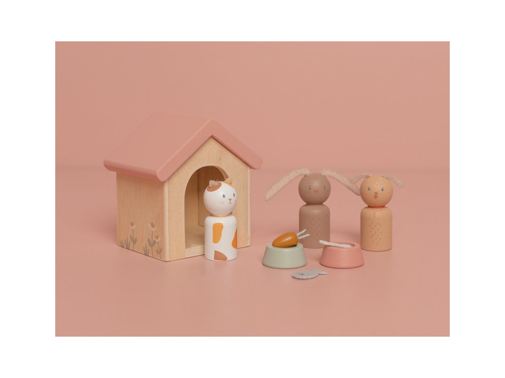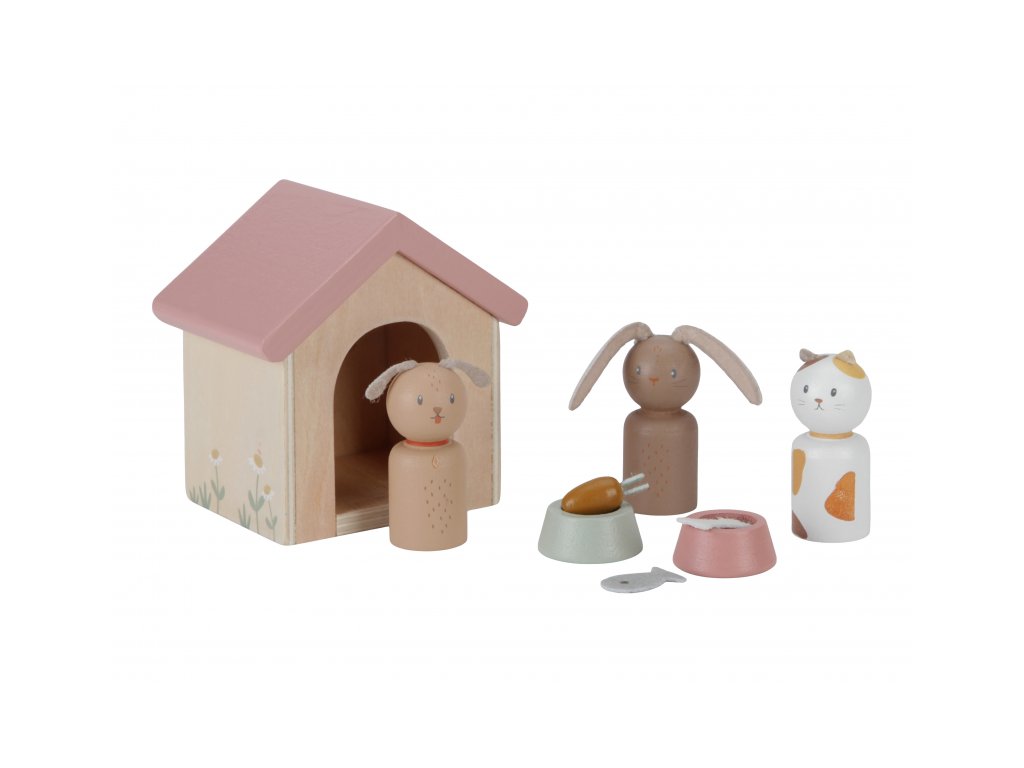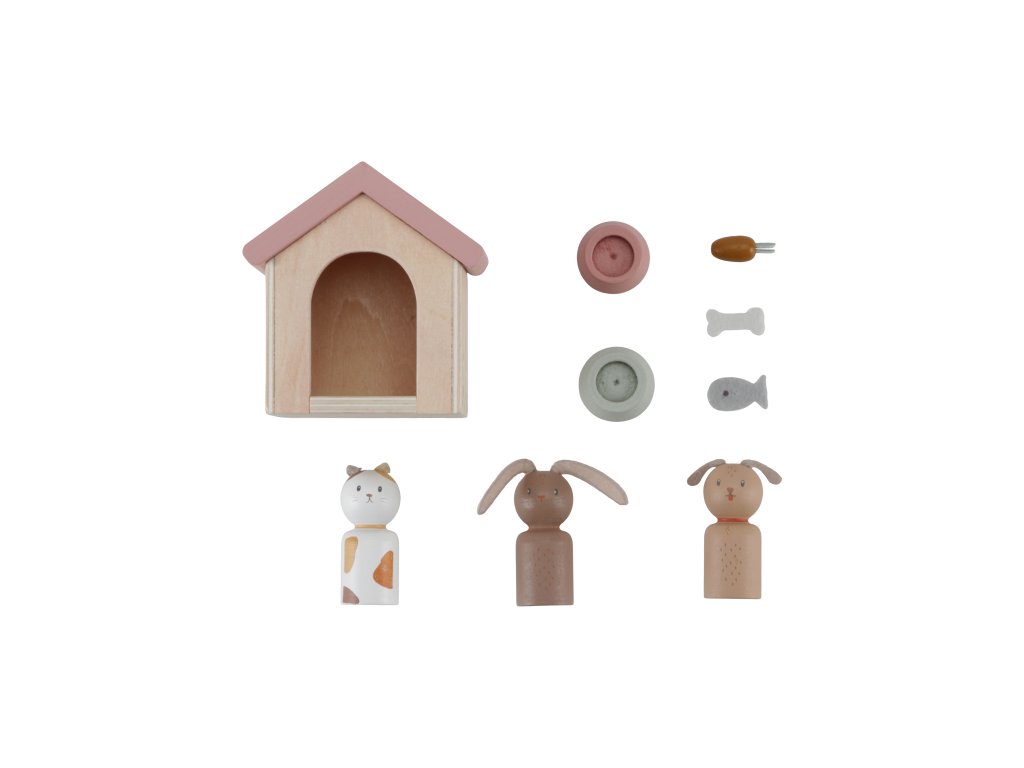 Sada s domácimi miláčikmi v krásnom drevenom prevedení je vhodný doplnok k drevenému domčeku pre bábiky Little Dutch.