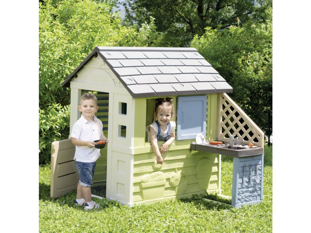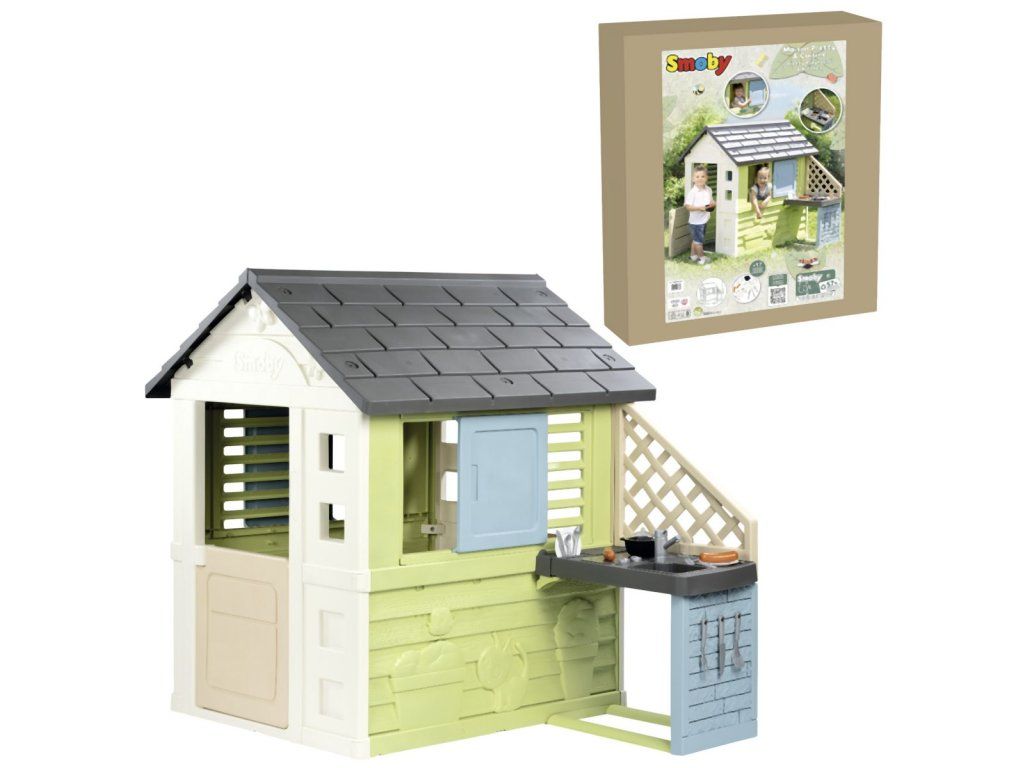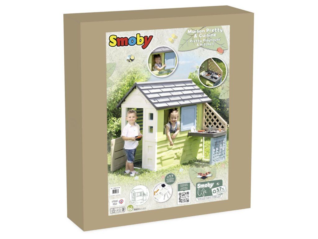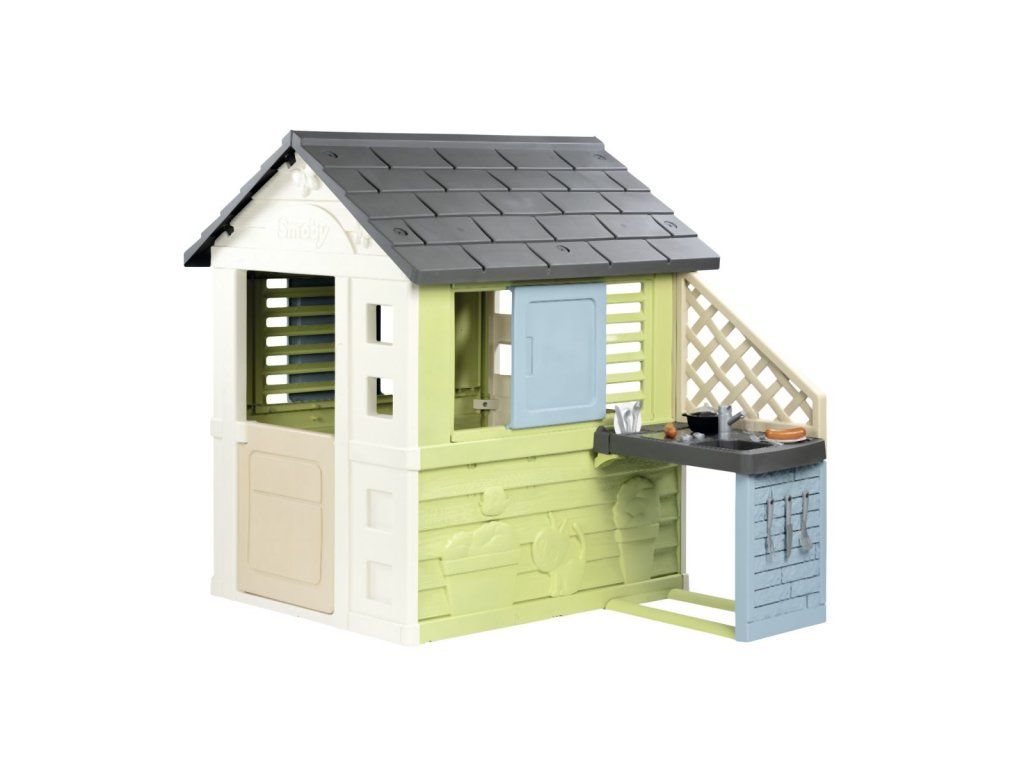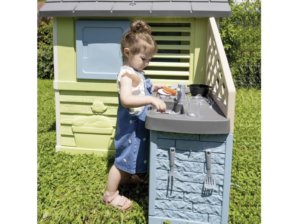 Stabilný, priestranný domček Smoby Life Pretty so skvelou letnou kuchynkou ponúka množstvo zábavy pre najmenších. Kuchynka je pripevnená ku vonkajšej stene, má drez s kohútikom (nefunkčný), grilovaciu dosku na varenie a grilovanie a policu na riad. Zážitok z varenia dopĺňajú 2 poháre, 2 taniere, rôzne kuchynské náčinie, klobásy a malá rajnica. Jednoduchá montáž. Módne farebné prevedenie v tyrkysovej a zelenej dodáva záhradnému domčeku svieži a moderný vzhľad. Štyri robustné bočné steny sú navrhnuté veľmi detailne, motýle a malá mačka zdobia fasádu a vytvárajú zábavný dizajn. Vybavenie domu dopĺňajú 2 okná s lamelami, 2 posuvné okná s možnosťou otvárania a zatvárania a malé vstupné dvere. Domček je vyrobený z vysoko kvalitného plastu odolného voči UV žiareniu a je obzvlášť odolný voči poveternostným vplyvom a vyblednutiu. Tento výrobok obsahuje minimálne 57 % recyklovaného materiálu. Rozmery produktu (DxŠxV): 145 x 110 x 127 cm.Dodatočné parametre
